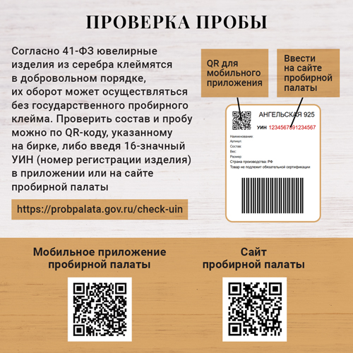 На каждом изделии есть проба, пломбы и бирка (сертификат изделия). Работаем официально - наличие свидетельства о постановке на учет в Пробирной палате РФ. Проверить состав и пробу можно по Qr-коду, указанному на бирке, либо введя 16-значный УИН (номер регистрации изделия) в приложении или на сайте Пробирной палаты.
