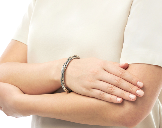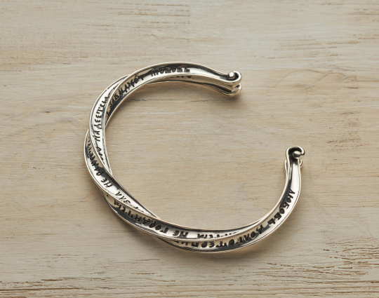 Православный браслет из серебра выполнен в виде закрученных линий, на которых находятся слова из Первого послания к Коринфянам Апостола Петра.