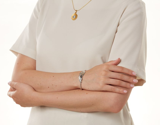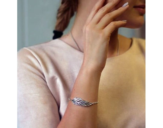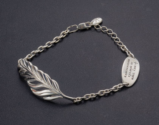 Изящный серебряный браслет из цепочки плетения «якорь», которая соединяет пальмовую ветвь и овальный медальон. Пальмовая ветвь имеет символичное значение и у верующих ассоциируется с Христом и его страданиями. На медальоне на лицевой и внутренней стороне нанесены слова, благословляющие Бога.