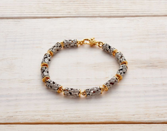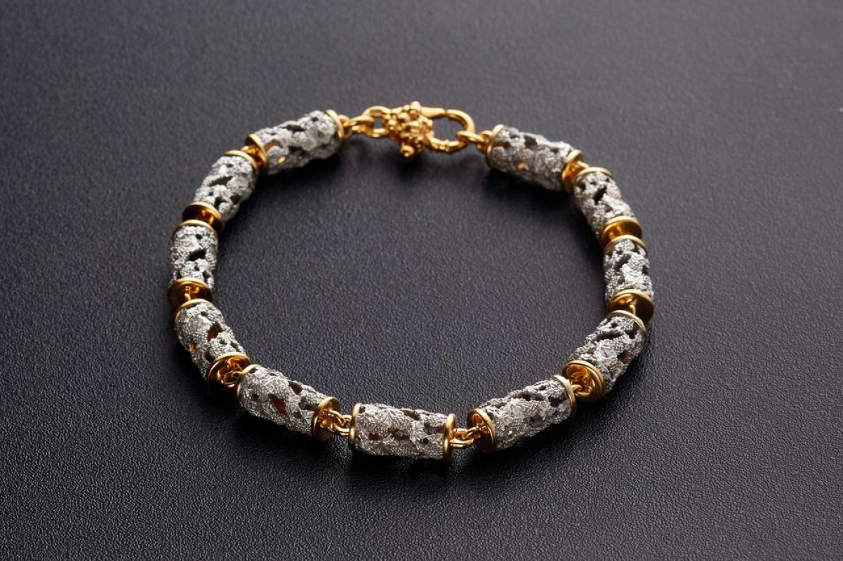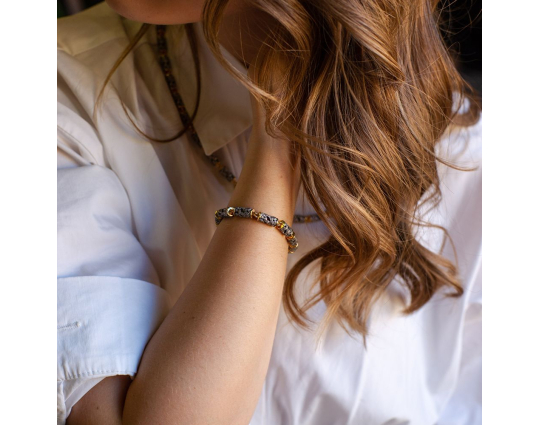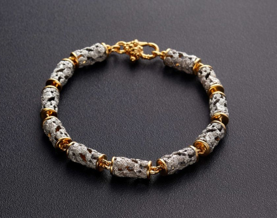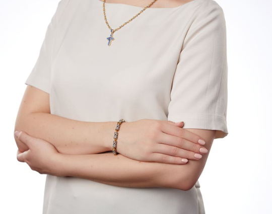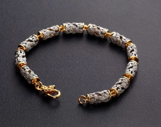 Серебряный браслет с позолотой, который состоит из пустотелых цилиндрических звеньев в виде сплетений виноградной лозы. Это - символ Иисуса Христа с древних времен. Прикоснуться люди к нему могут через причастие.