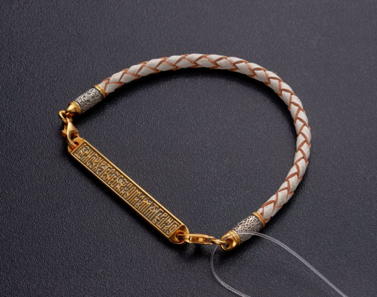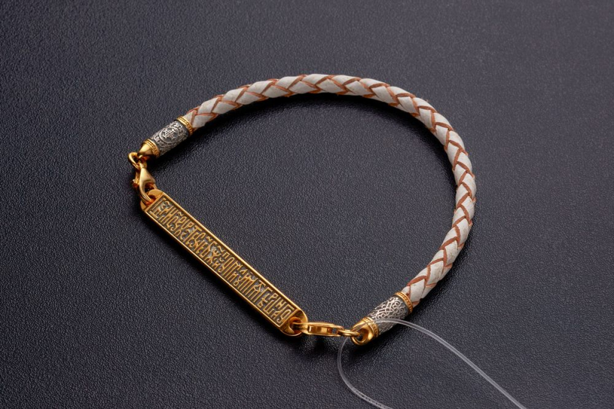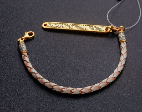 Кожаный плетеный браслет со вставкой из серебряной с позолотой пластины. На вставку нанесены слова-обращения к Иисусу Христу: просьба о помощи в преодолении испытаний и борьбе с искушениями, прошение о помиловании.