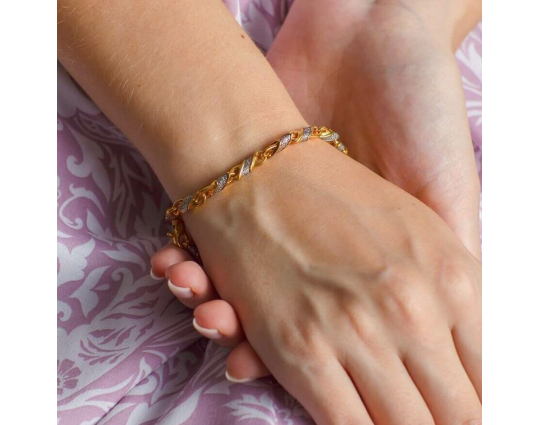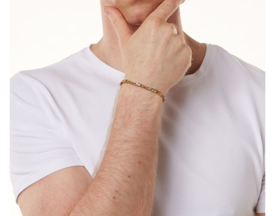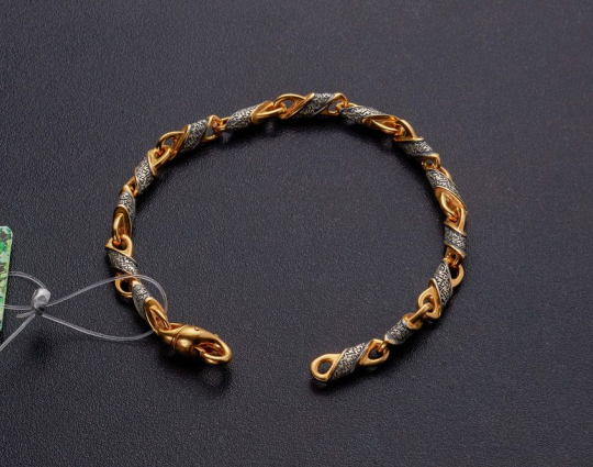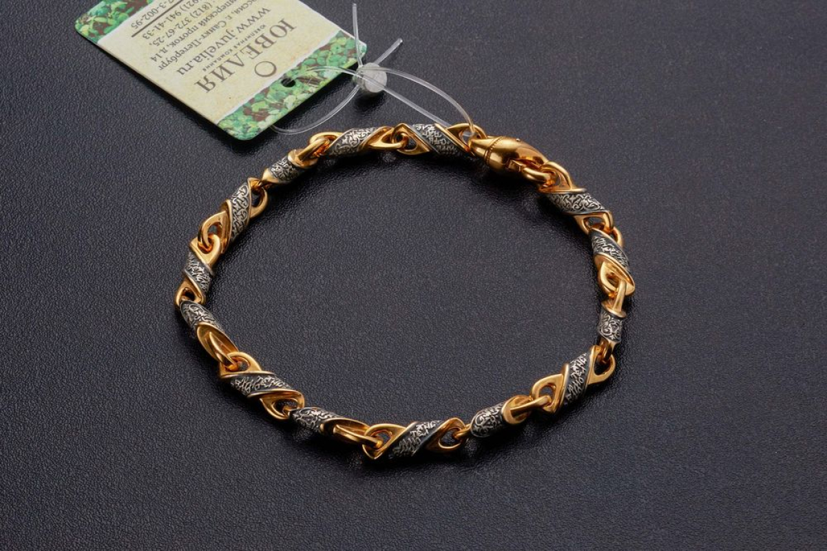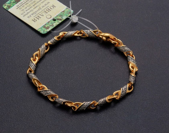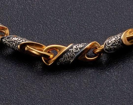 Серебряный браслет с позолоченной отделкой. Он собран из чередующихся литых звеньев. На одном из них написана молитва Ангелу-Хранителю, на другом - нанесен изящный византийский орнамент.