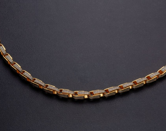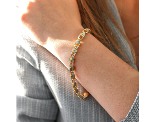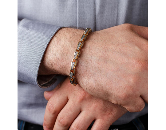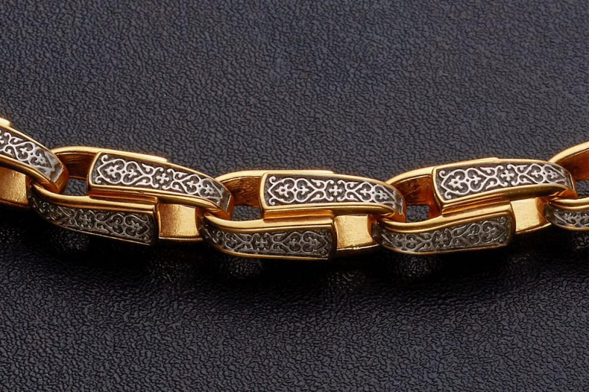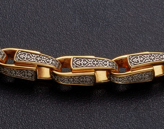 Серебряный браслет с позолоченной отделкой. Он состоит из литых звеньев, которые украшены изящным византийским орнаментом с вплетенным в него крестом под названием «Трилистниковый». Эта форма креста чаще всего используется у православных христиан, особенно в России.