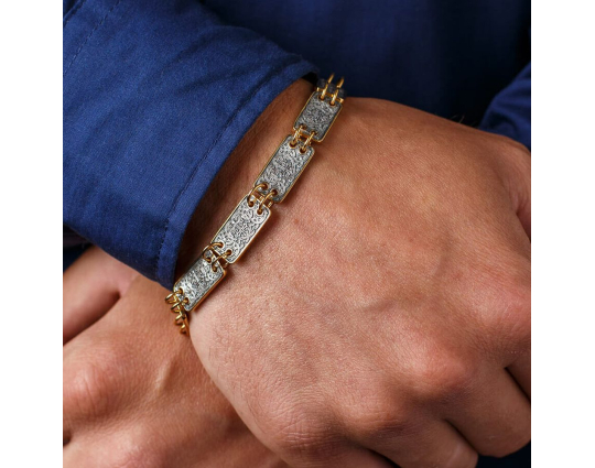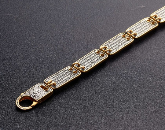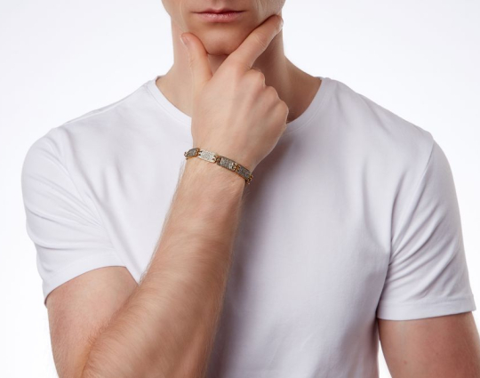 Между собой пластины скрепляются небольшими парными колечками, покрытыми позолотой. Это зрительно облегчает конструкцию браслета и, поэтому, его можно носить как мужчинам, так и женщинам.