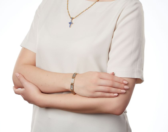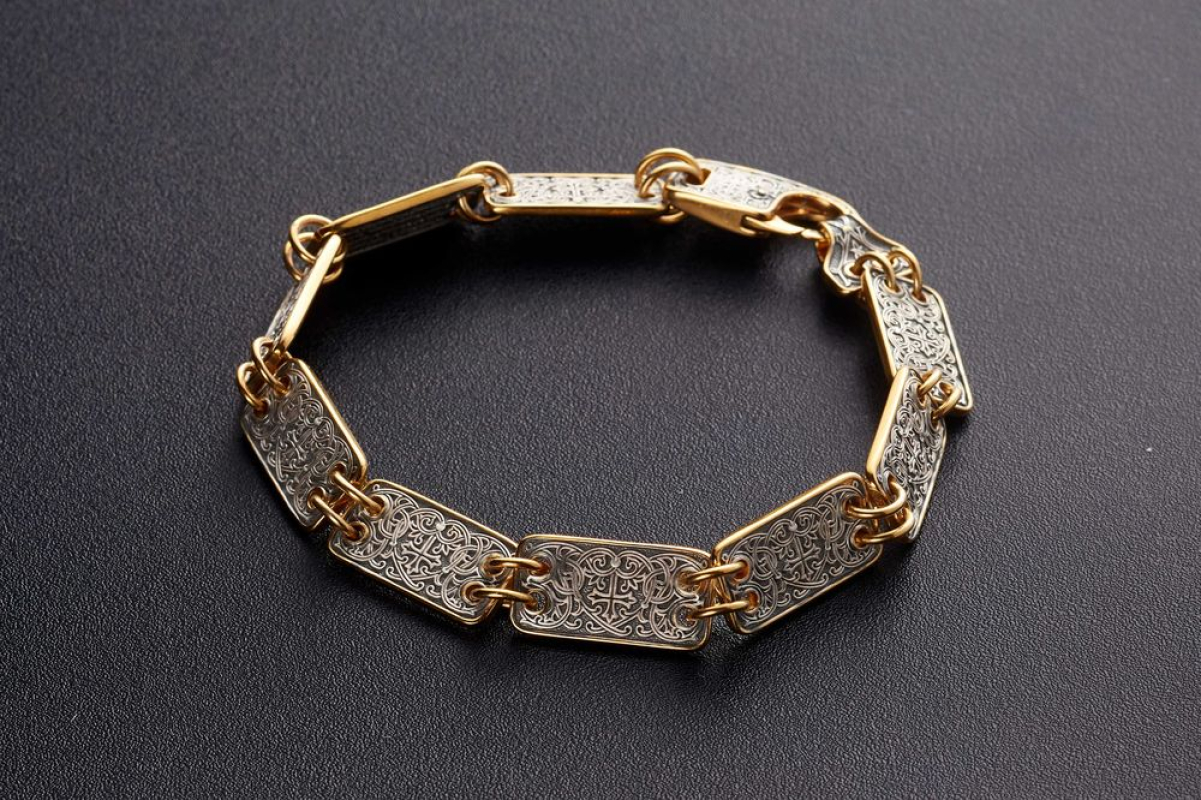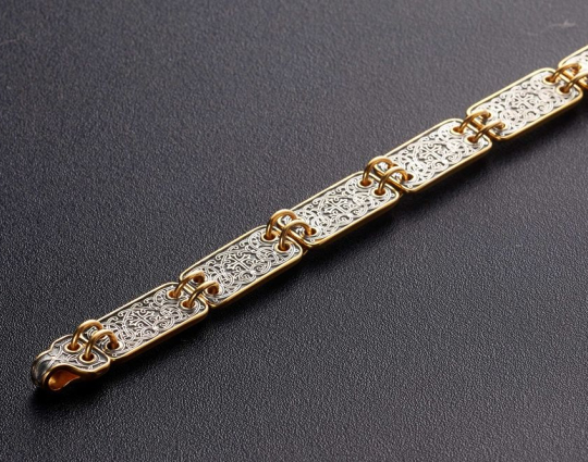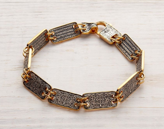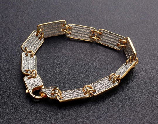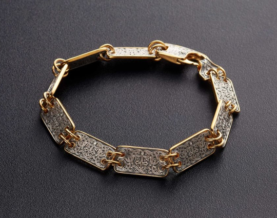 Серебряный браслет с позолотой, который состоит из 12 пластин. На каждую из них, на внутреннюю сторону, нанесен текст одного из догматов православной веры. Догмат - это основа, но которой базируется христианское вероучение.