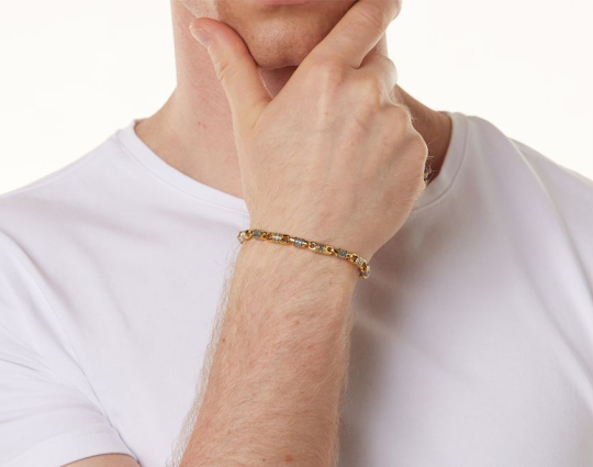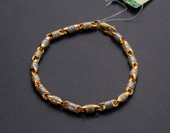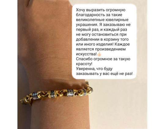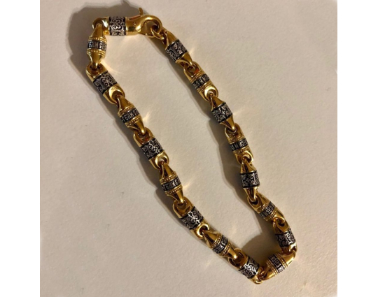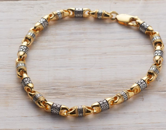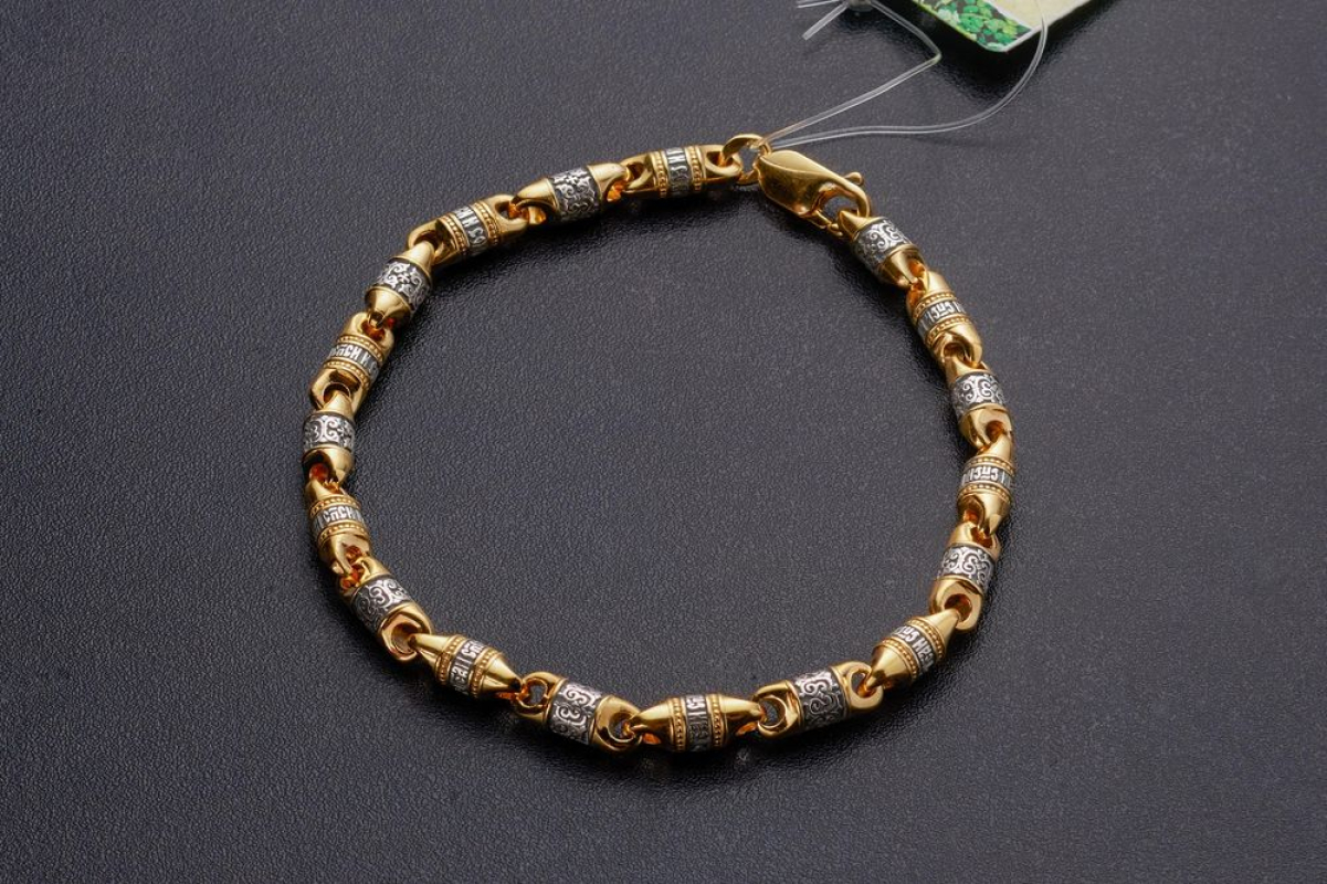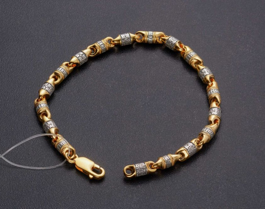 Браслет из серебра с позолоченной отделкой. Он состоит из литых звеньев, которые чередуются между собой. На одном из них написано обращение Всевышнему- молитва "Господи Спаси и Сохрани", на другом - нанесен изящный византийский орнамент.