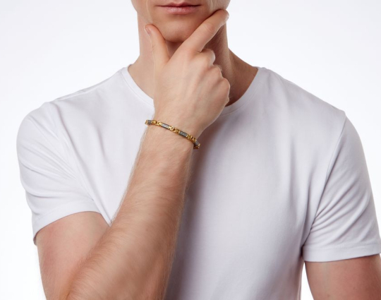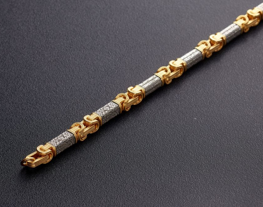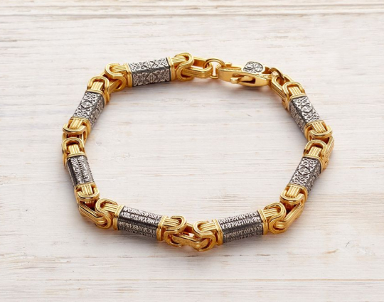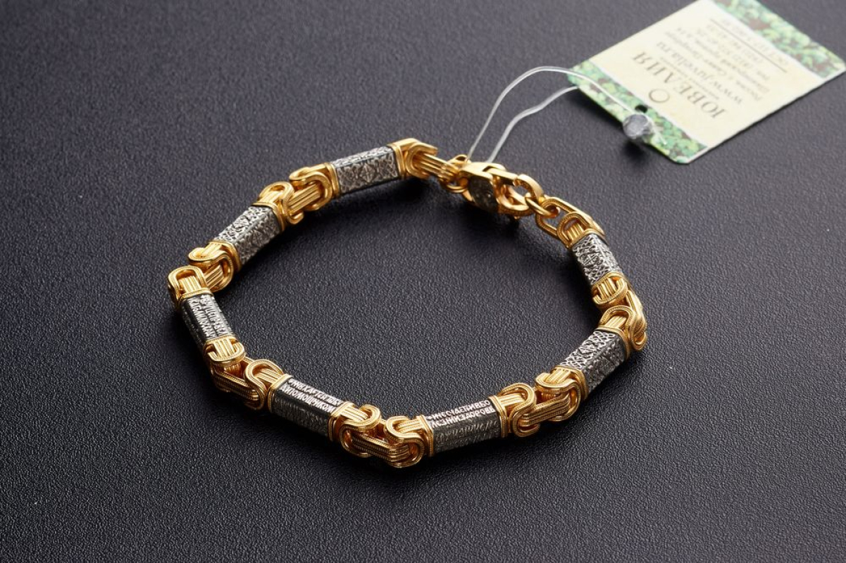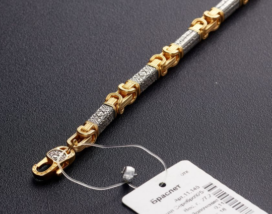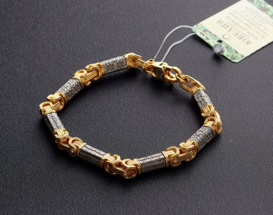 Серебряный браслет, состоящий из объемных звеньев, соединенных между собой изящным позолоченным элементом. Первые два звена от замка, с двух концов браслета, украшены старинным византийским орнаментом в виде переплетающихся лилий. На остальных - текст молитвы Антония Оптинского "О семье".