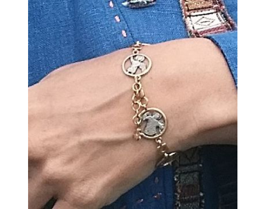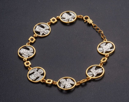 Необычный, но очень красивый браслет, который состоит из 7 образков с Ангелами-Хранителями и небольшими квадратными звеньями-вставками между ними. Каждый Ангел выполнен по индивидуальному рисунку, т.е. все 7 образков разные.