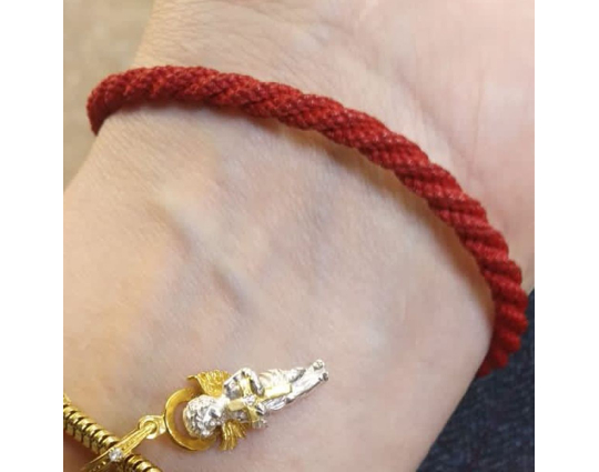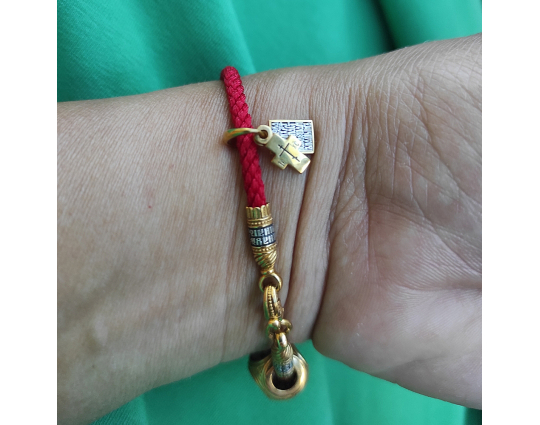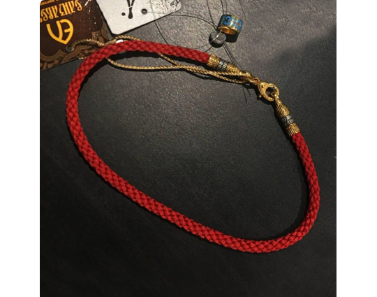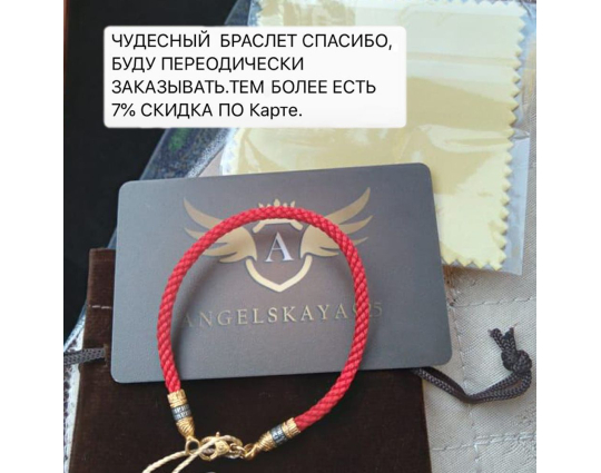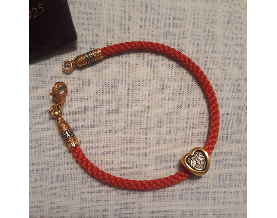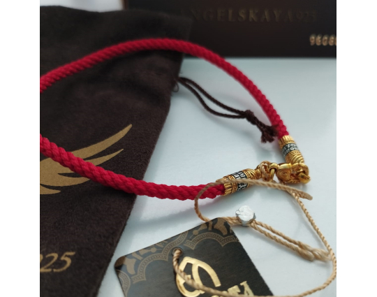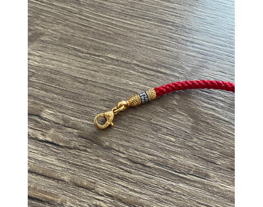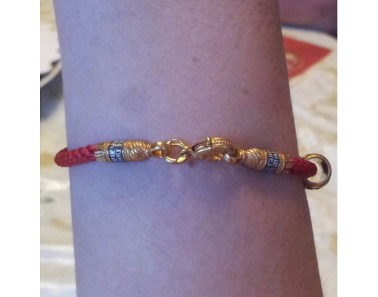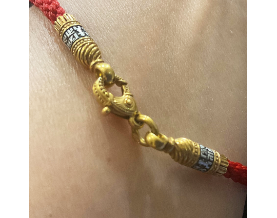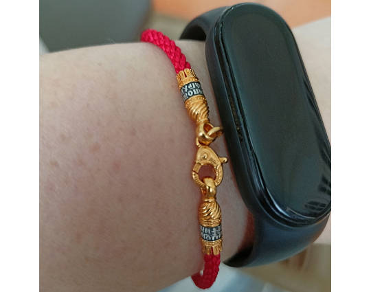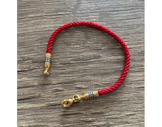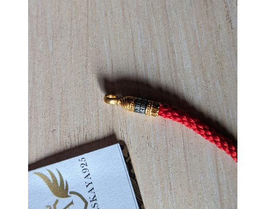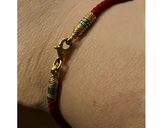 Текстильный плетеный браслет ручной работы. На его концах - специальные серебряные с позолотой зажимы в форме куполов. На них написаны слова – обращения к Богу. Замком служит съемный карабин.