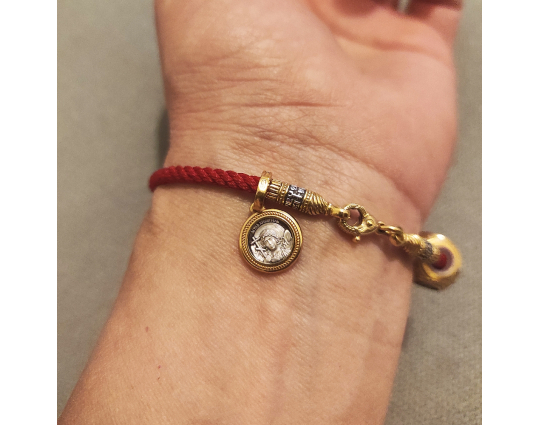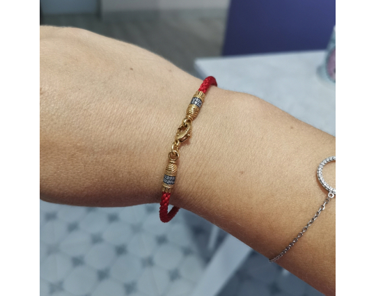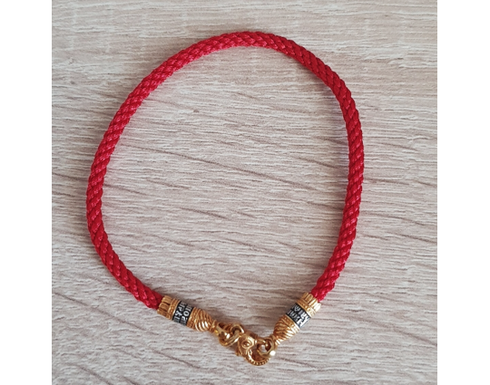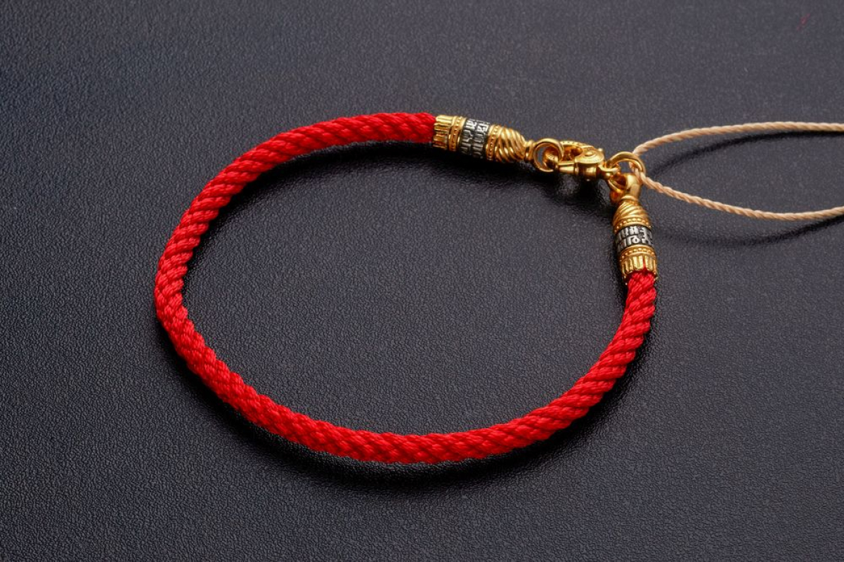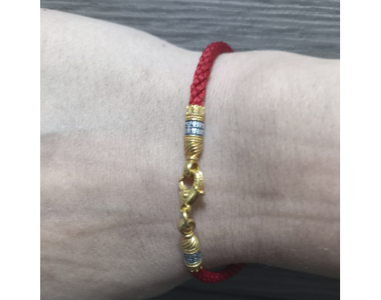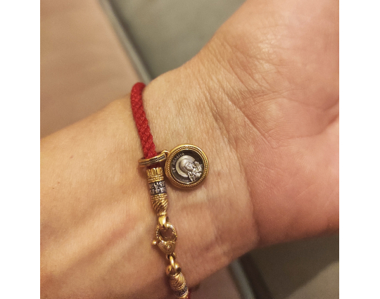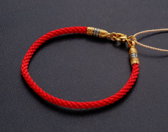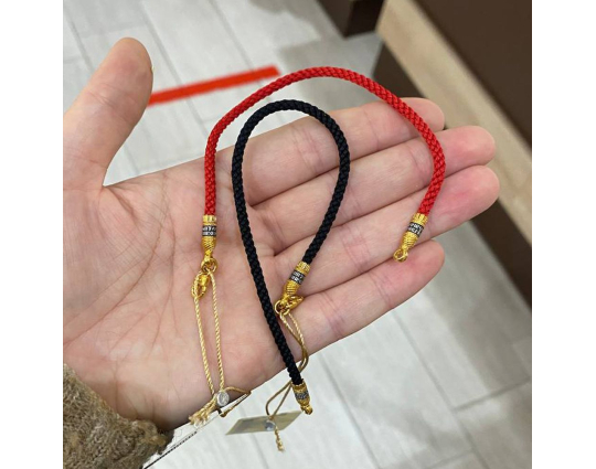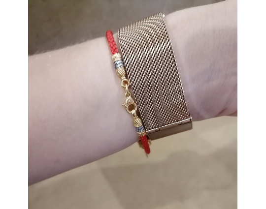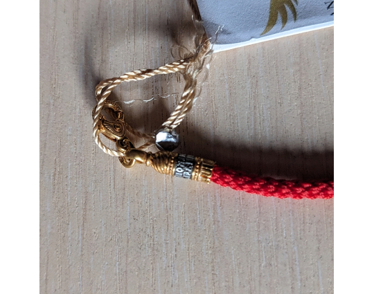 Текстильный плетеный браслет ручной работы. На его концах - специальные серебряные с позолотой зажимы в форме куполов. На них написаны слова – обращения к Богу. Замком служит съемный карабин.