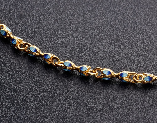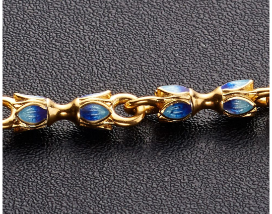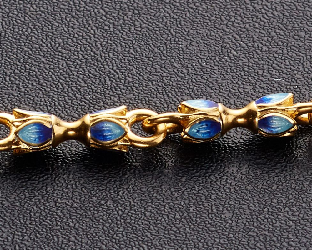 Позолоченный браслет с изящными звеньями в виде бутонов весенних, пасхальных цветов - тюльпанов. Звенья украшены эмалевой росписью нежного небесно-голубого цвета, который ассоциируется с пробуждением природы после долгой зимы и холодов.