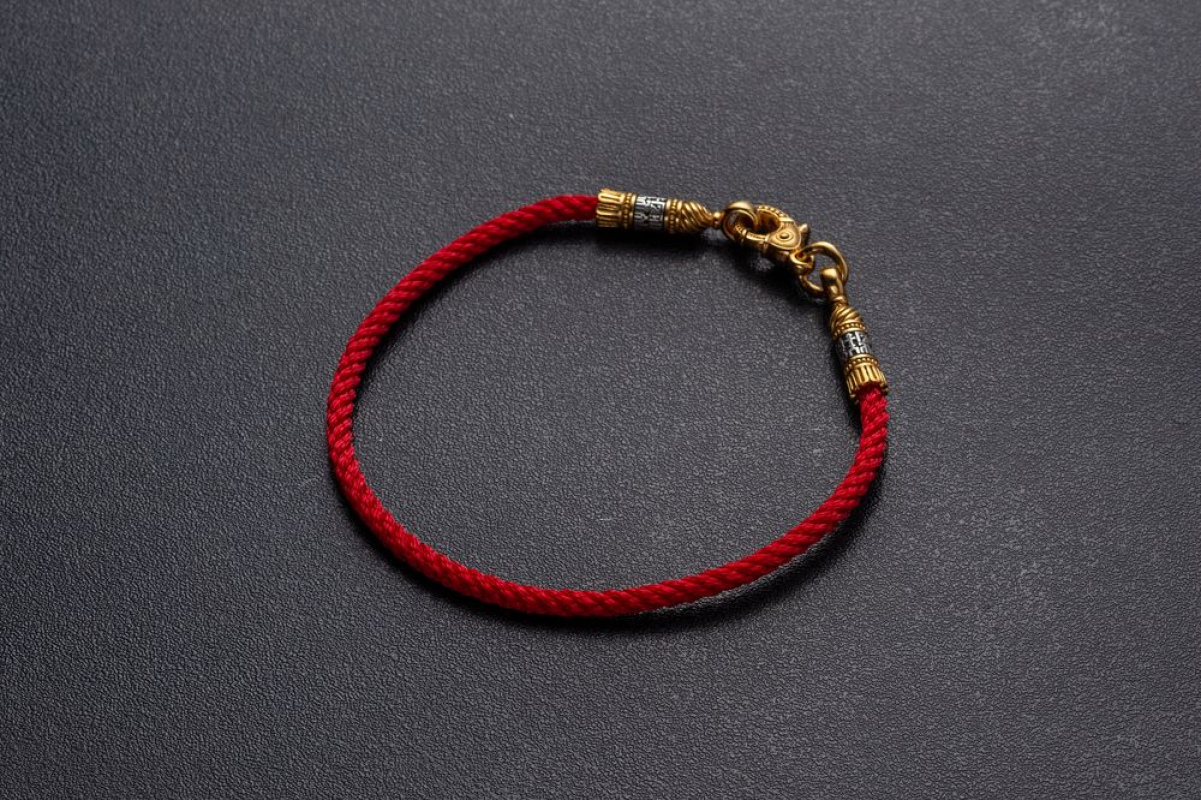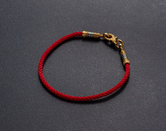 Текстильный плетеный браслет ручной работы. На его концах - специальные серебряные с позолотой зажимы в форме куполов. На них написаны слова – обращения к Богу. Замком служит съемный карабин.