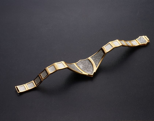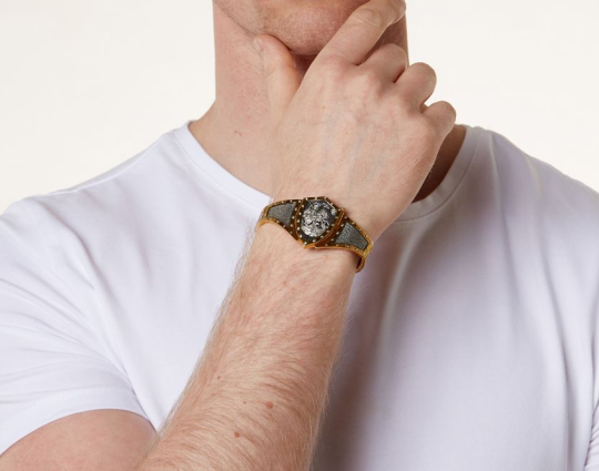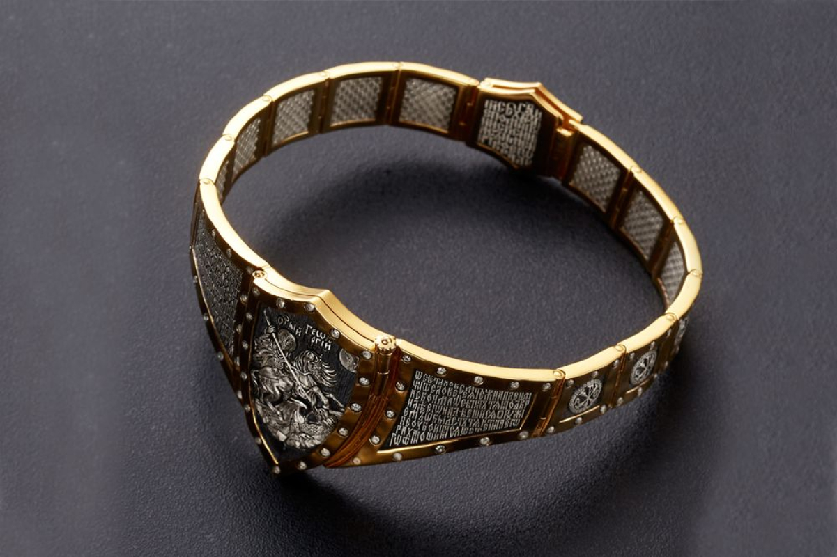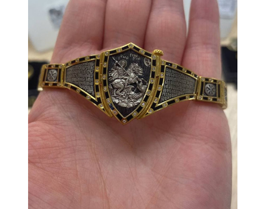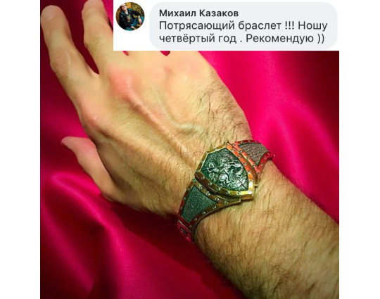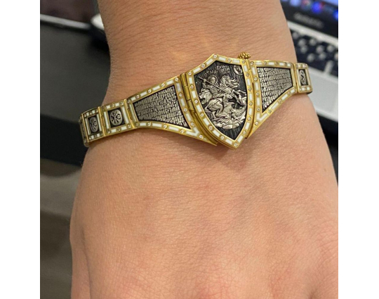 Массивный эффектный браслет, на центральном звене которого изображен Святой Георгий во время свершения его знаменитого подвига: спасение принцессы от змея. Притом, считается, что принцесса символизирует душу человека, а змей - дьявола-искусителя. Победа Георгия означает то, что душа спасена от гибели.