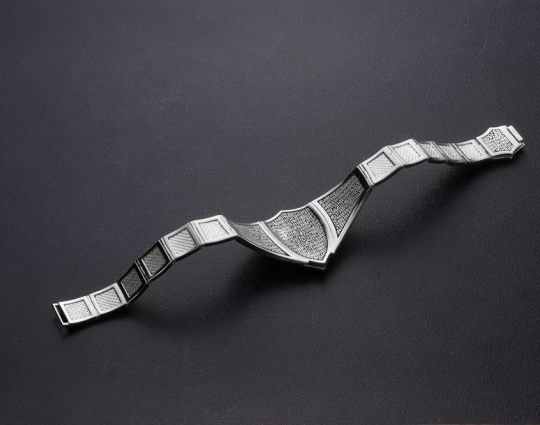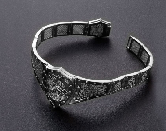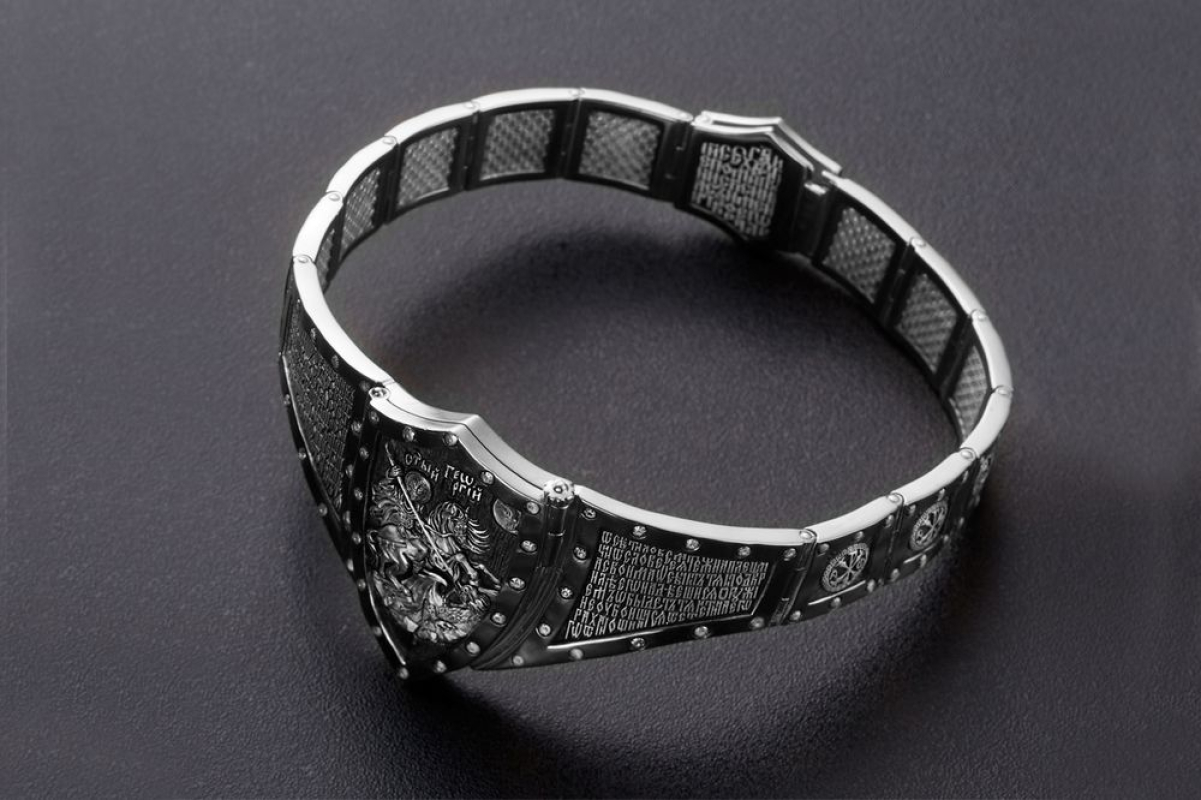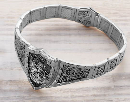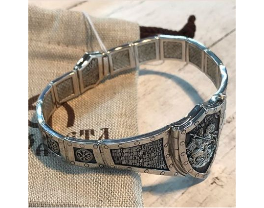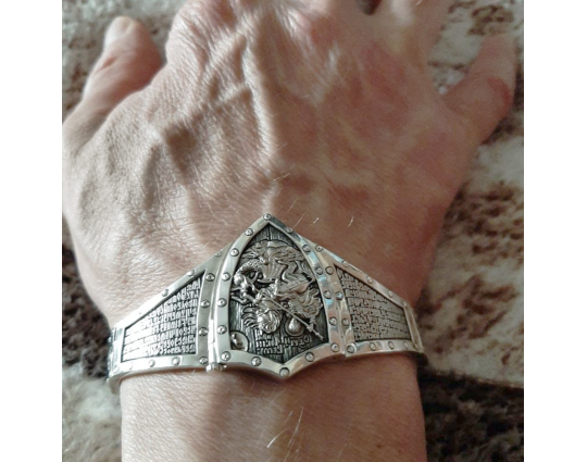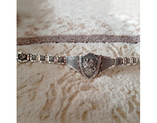 Массивный эффектный браслет, на центральном звене которого изображен Святой Георгий во время свершения его знаменитого подвига: спасение принцессы от змея. Притом, считается, что принцесса символизирует душу человека, а змей - дьявола-искусителя. Победа Георгия означает то, что душа спасена от гибели.