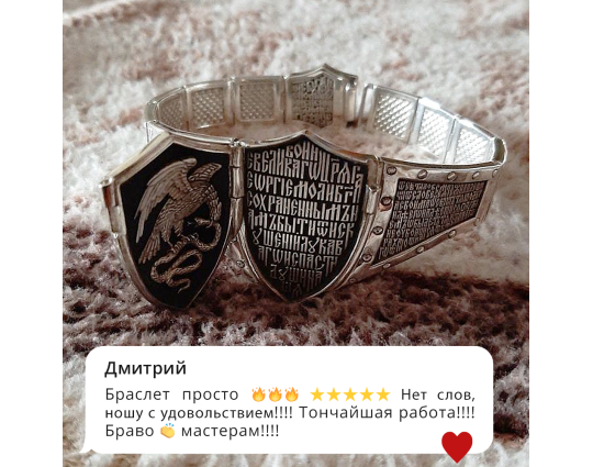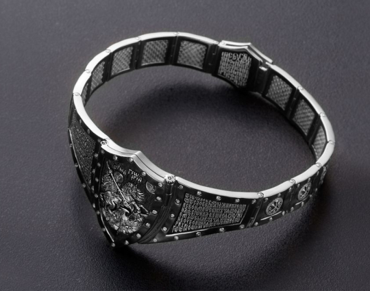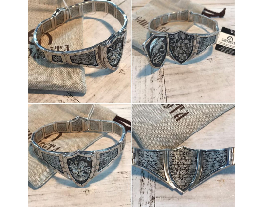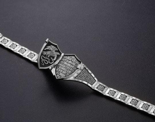 На двух соседних звеньях написана молитва из Псалма 90. Она носится для духовной защиты.Остальные звенья украшены знаком Христа- Хризмой. Также браслет украшает прочный замок.