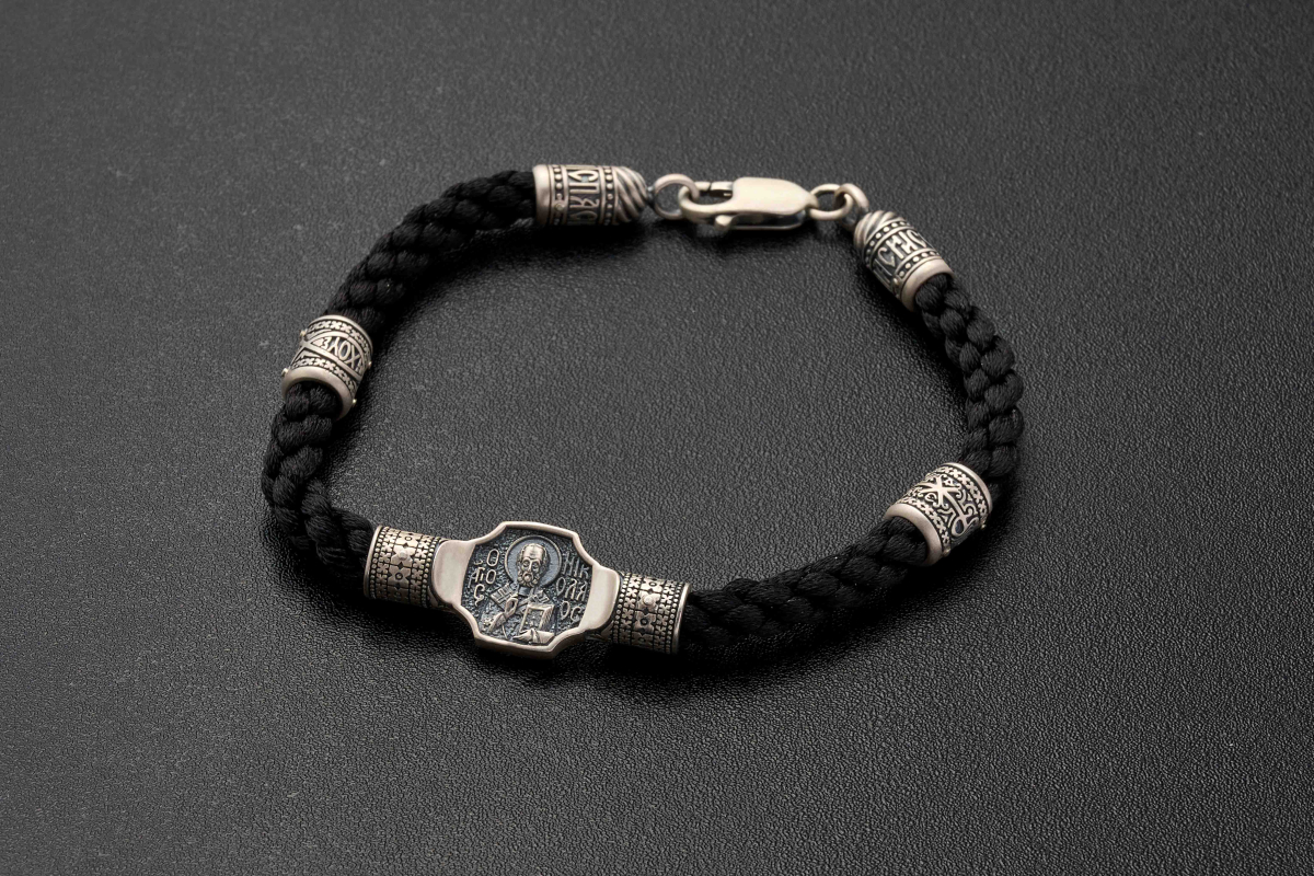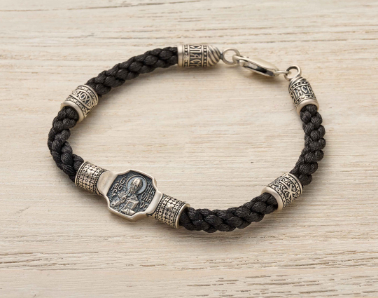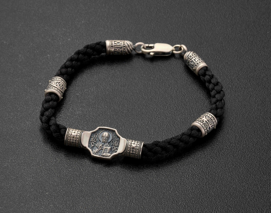 Православный браслет из текстиля с подвесками-бусинами из серебра 925 пробы. На центральной находится образ святого Николая Чудотворца.  Он дает защиту и благословение в путешествиях, семейных делах и помогает тем, кто столкнулся с несправедливостью.