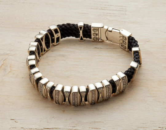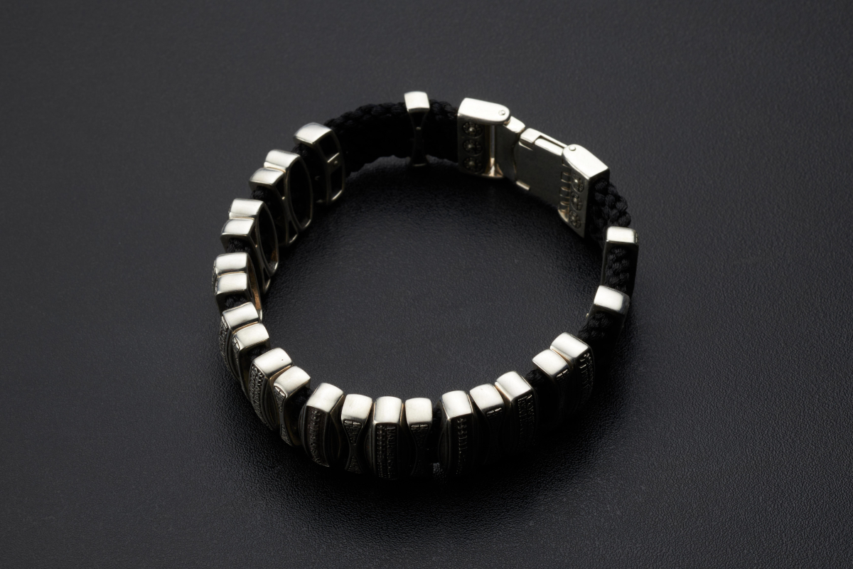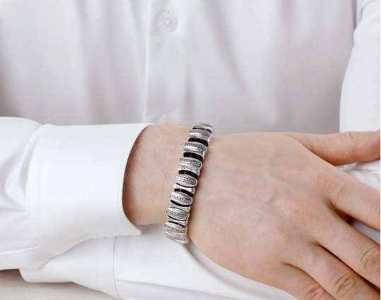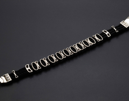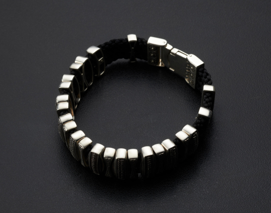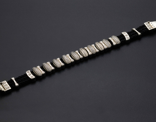 Вставки на православном браслете выполнены из серебра 925 пробы. Сам браслет, его основа, изготовлен из текстиля. На вставках находятся по одной из десяти заповедей. Это основные законы,