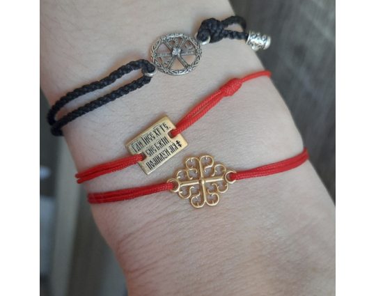 Текстильный браслет с подвеской из серебра 925 пробы, на которой изображен православный равносторонний процветший крест - главный души, в которой хранится вера, а так же - гармонии и завершенности мира.