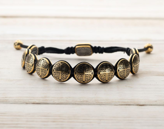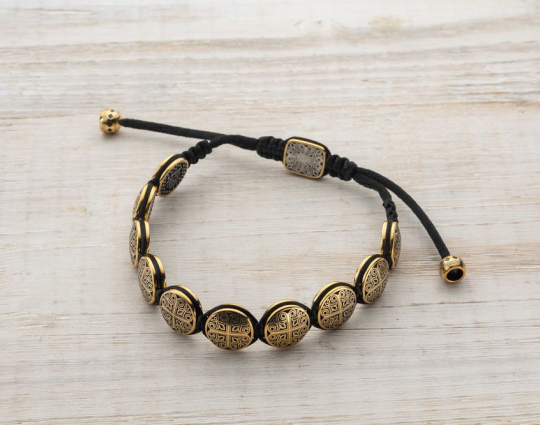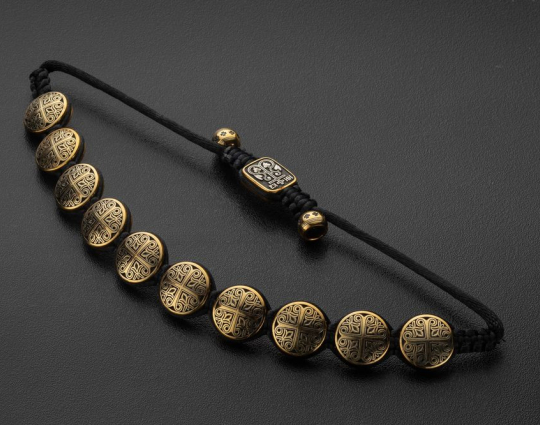 Вставки на браслете выполнены из серебра 925 пробы с позолотой. Они украшены орнаментом с равносторонними крестами - символом гармонии христианского мира, его упорядоченности. На центральной вставке размещено изображение Процветшего креста. Это образ души, в которой вместе с верой произрастают христианские добродетели - любовь и надежда.