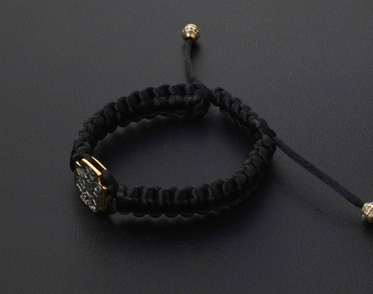 Вставки на браслете выполнены из серебра 925 пробы с позолотой. Браслет имеет достаточно широкий диаметр. Он не расстегивается, размер регулируется путем стягивания концов.