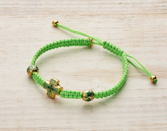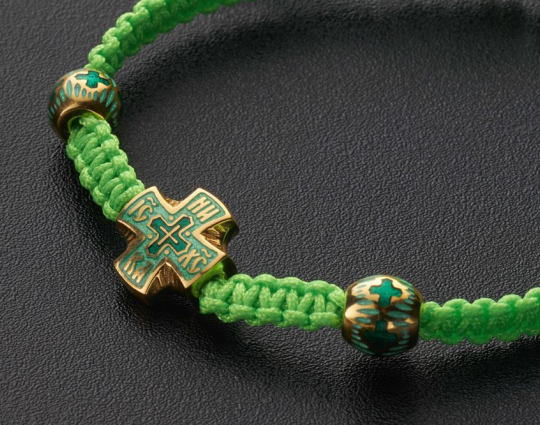 Православный браслет из текстиля с крестиком из серебра с эмалью | b20pz_lightgreen | Серебро 925 пробы, позолота, текстиль