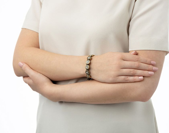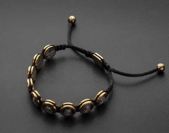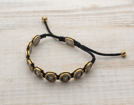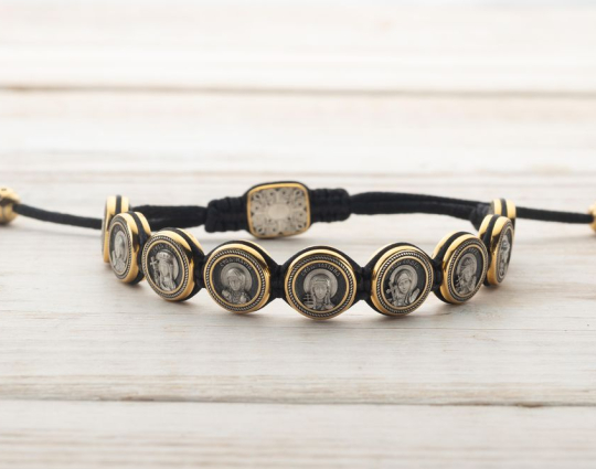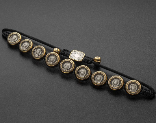Вставки на браслете выполнены из серебра 925 пробы с позолотой. На каждом из них размещены образы святых жен. Это женщины, святые покровительницы и помощницы в различных делах. На обратной стороне той, которая находится на замке, изображена Хризма - древний символ Христа, образованный слиянием первых букв его имени.
