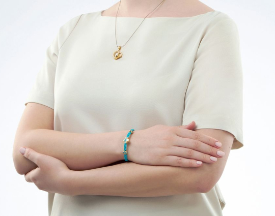 Текстильный безразмерный браслет выполнен вручную из текстиля салатового цвета. Бусины изготовлены из серебра 925 пробы с позолотой и эмалью.