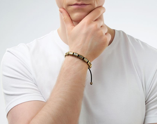 Вставки на браслете выполнены из серебра 925 пробы. Основа выполнена из текстиля. Диаметр браслета изменяется за счет затягивания/ослабления "усиков" с бусинками. Он не расстёгивается, никакого замочка нет, одевается путем увеличения его размера до максимума. Подойдёт на любой размер, запас очень большой. Лишнюю длину "усиков" можно обрезать.