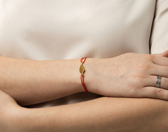 Подвеска на браслете выполнена из серебра 925 пробы с позолотой. Размер текстильного браслета регулируется с помощью узелков от 16 до 24 см.