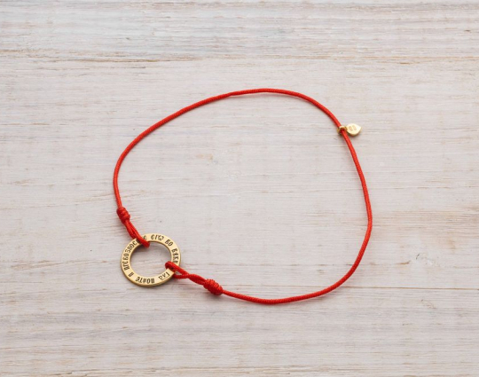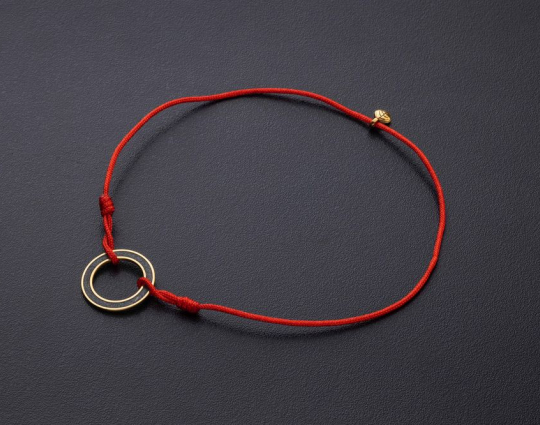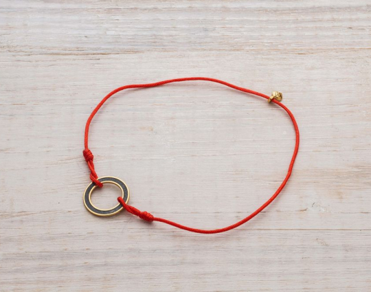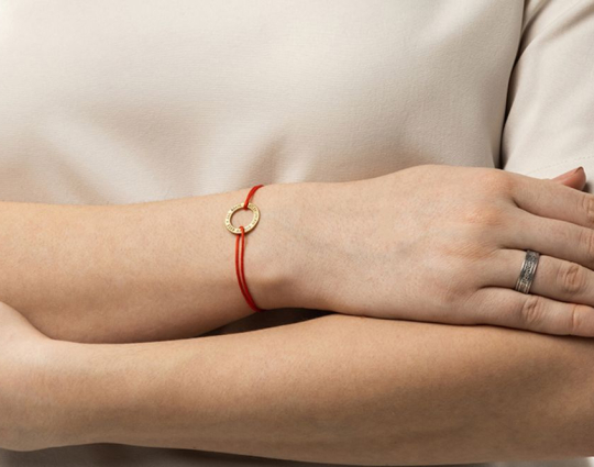 Текстильный браслет с подвеской из серебра 925 пробы в форме круга. Размер можно подобрать от 16 до 24 см. Он регулируется при помощи двух узелков.