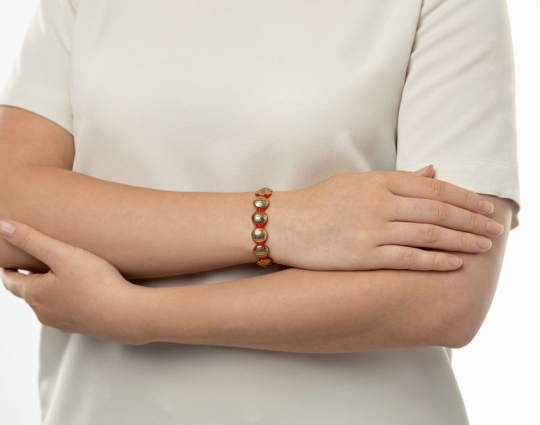 позолотой. Браслет имеет достаточно широкий диаметр. Он не расстегивается,
