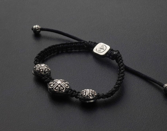 Вставки на браслете выполнены из серебра 925 пробы. Браслет имеет достаточно широкий диаметр. Он не расстегивается, размер регулируется путем стягивания концов.