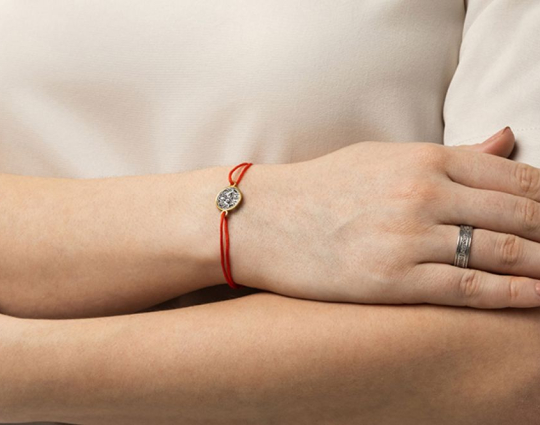 Текстильный браслет с подвеской из серебра 925 пробы с позолотой. Размер регулируется от 16 до 24 см при помощи двух узелков.