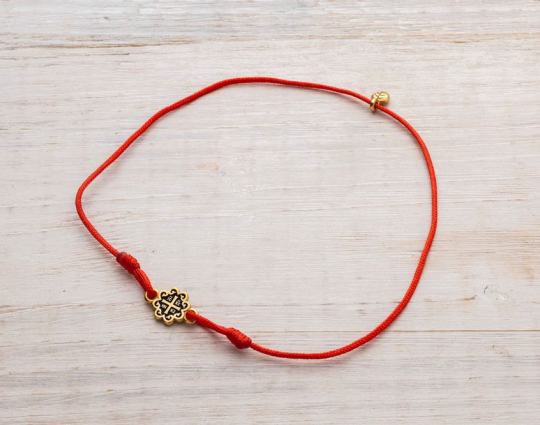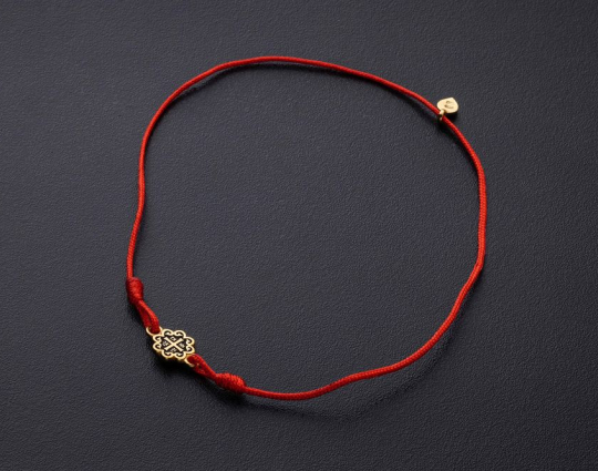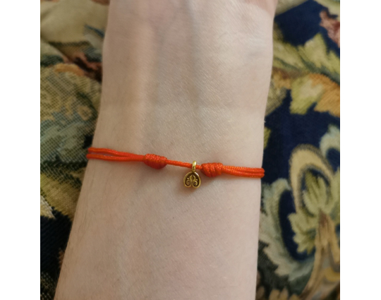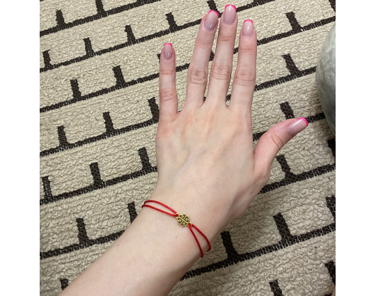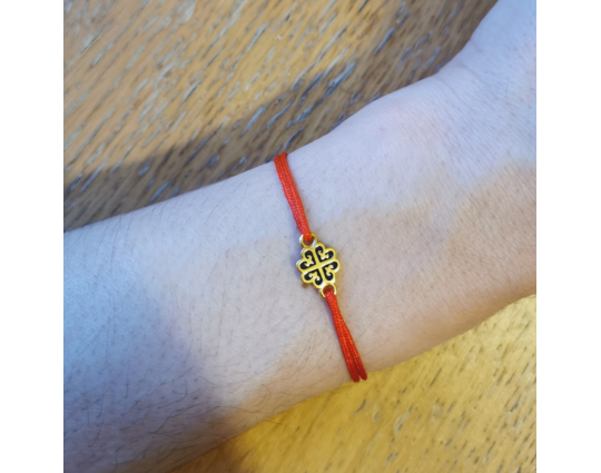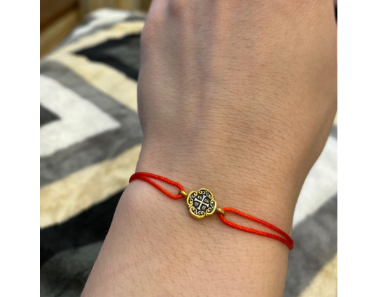 На текстильном браслете находится подвеска из серебра 925 пробы с позолотой с изображение равностороннего креста - главного символа православия, которые так же означает гармонию и завершенность мира. По сторонам его находятся инициалы Иисуса Христа и слово "ника" - победа над смертью.