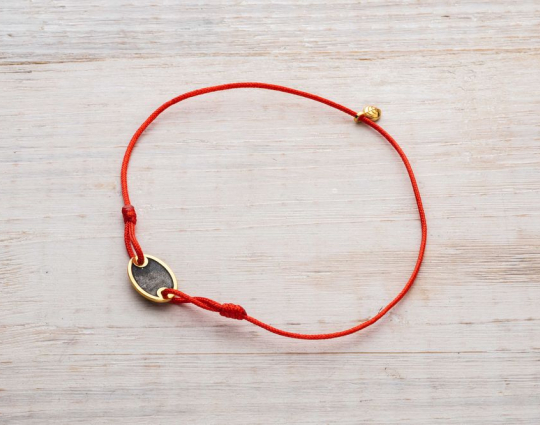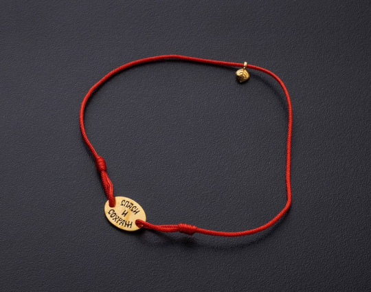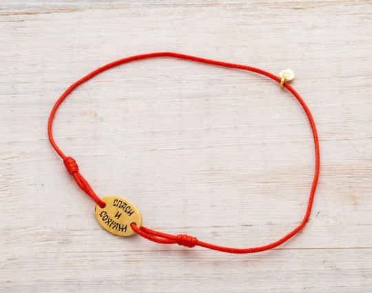 Изящный и легкий браслет состоит из текстильной нити и подвески из серебра 925 пробы с позолотой. На подвеске находятся слова "Спаси и Сохрани" - главной короткой молитвы, отражающей суть взаимоотношений между человеком и Господом.