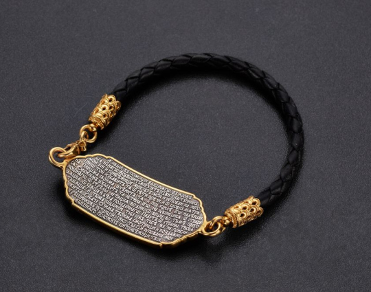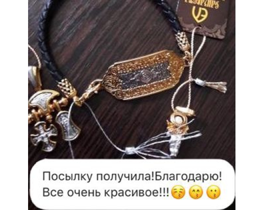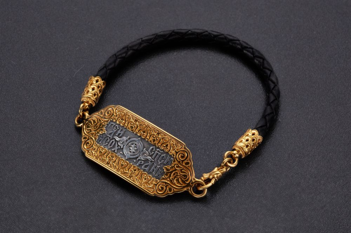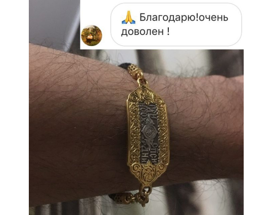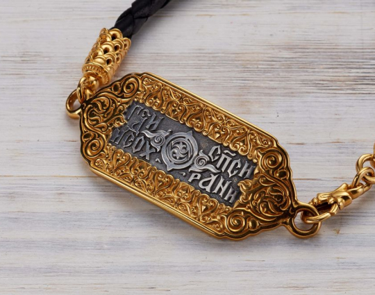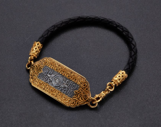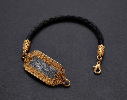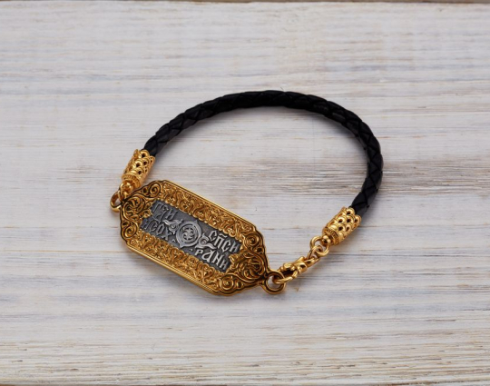Необычный браслет, который подойдет как мужчинам, так и женщинам. На кожаном прочном шнурке закреплена пластина с православными охранительными молитвами. Контур пластины позолочен и украшен замысловатым орнаментом, отдаленно напоминающим византийский узор. Центральная часть пластины оставлена серебряной и на нее нанесены молитвы, как на внешней, так и на внутренней стороне. Крепления между шнурком и пластиной также позолочены.