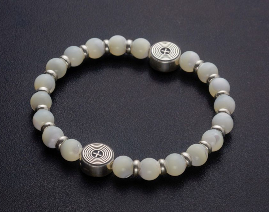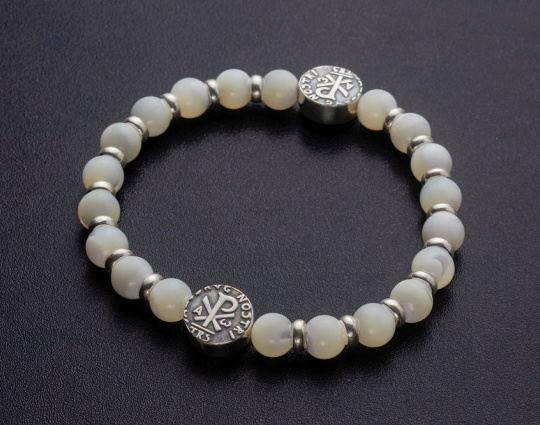 Четки из 20 гладких бусин из белого агата, которые отделяются друг от друга небольшими серебряными кольцами. Также на основе закреплено 2 круглые плоские бусины, которые украшены монограммой Хризмой. Она обозначает, что Христос является Помазанником Божьим. На обратной стороне этих бусин расположены узкие полоски и крест.
