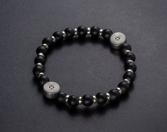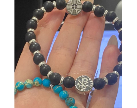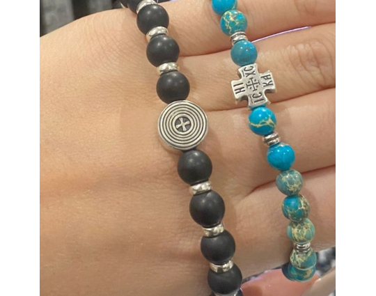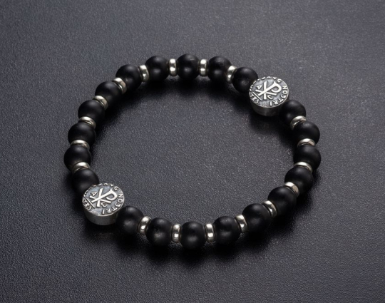 Четки из 20 гладких угольно-черных бусин из черного агата, которые отделяются друг от друга небольшими серебряными кольцами. Также на основе закреплено 2 круглые плоские бусины, которые украшены монограммой Хризмой. Она обозначает, что Христос является Помазанником Божьим. На обратной стороне этих бусин расположены узкие полоски и крест.