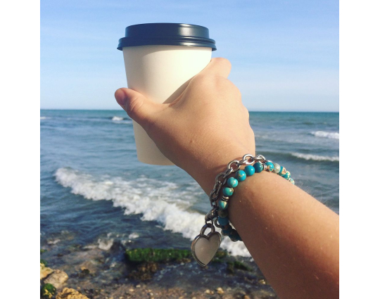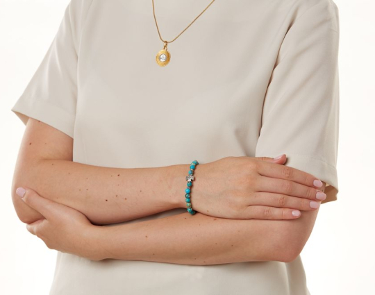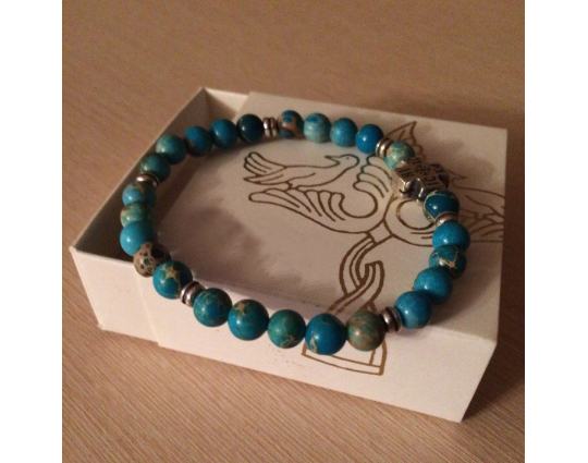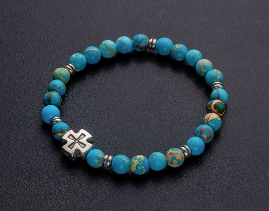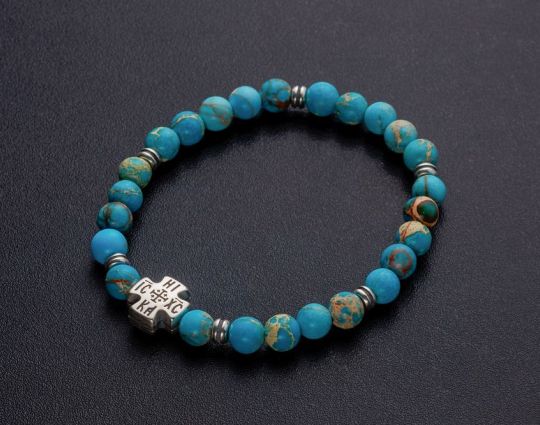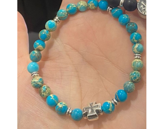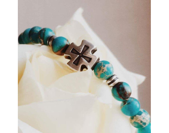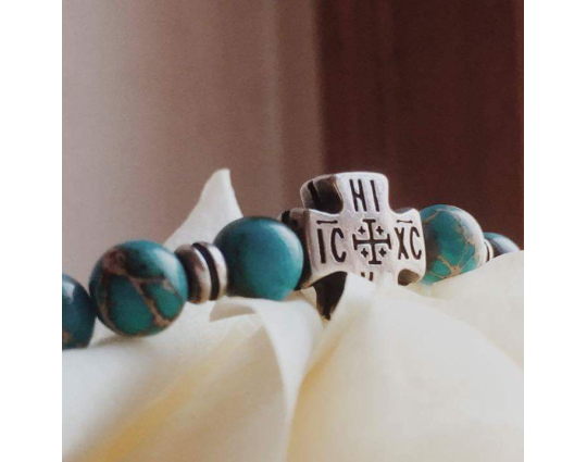 Четки из натуральной калифорнийской бирюзы со вставкой «Иерусалимский крест», которая сочетается с цветом камней и дополняет основу. На обратной стороне креста нанесено: IC XC, НIКА.