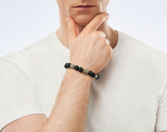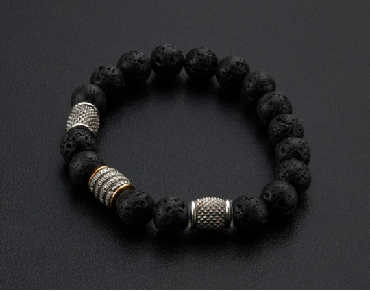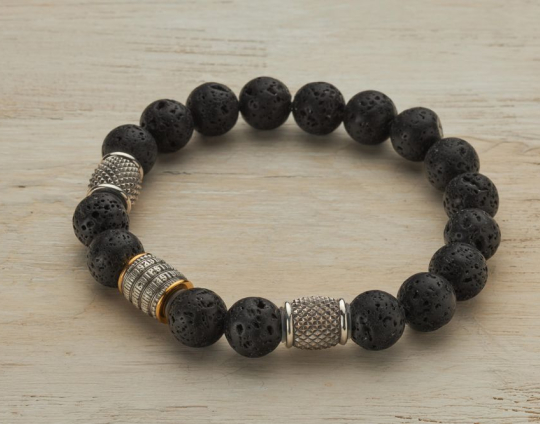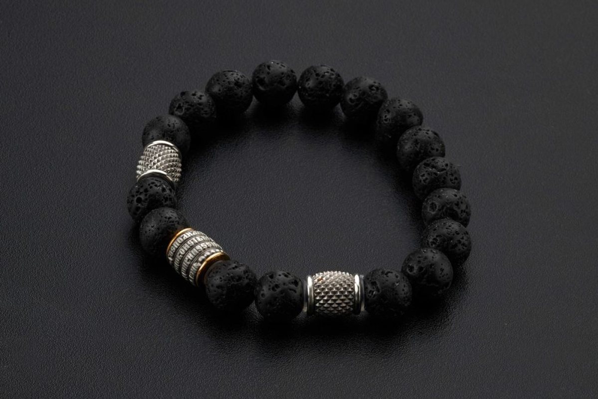 Православный браслет выполнен из вулканической лавы и трех бусин из серебра с чернением. На центральной написана молитва Оптинских старцев на начало дня.