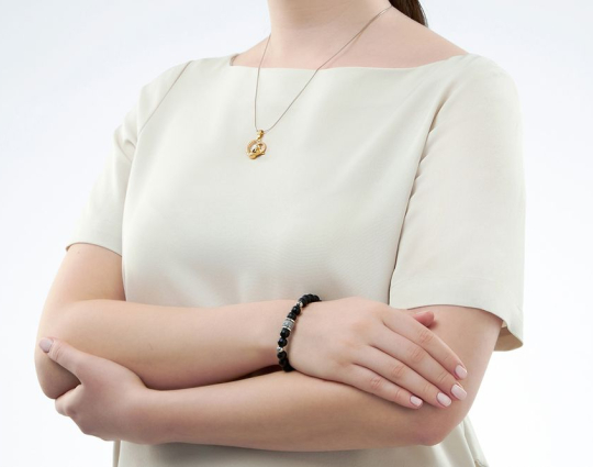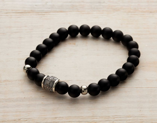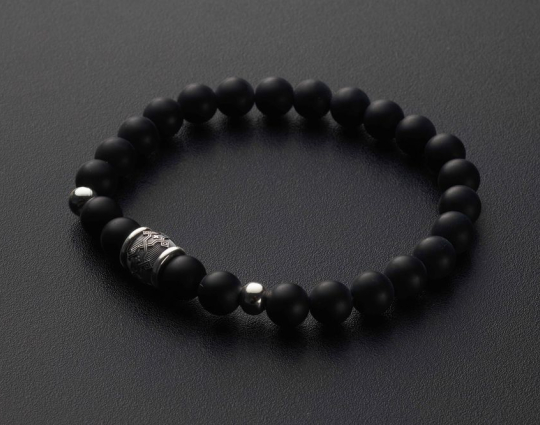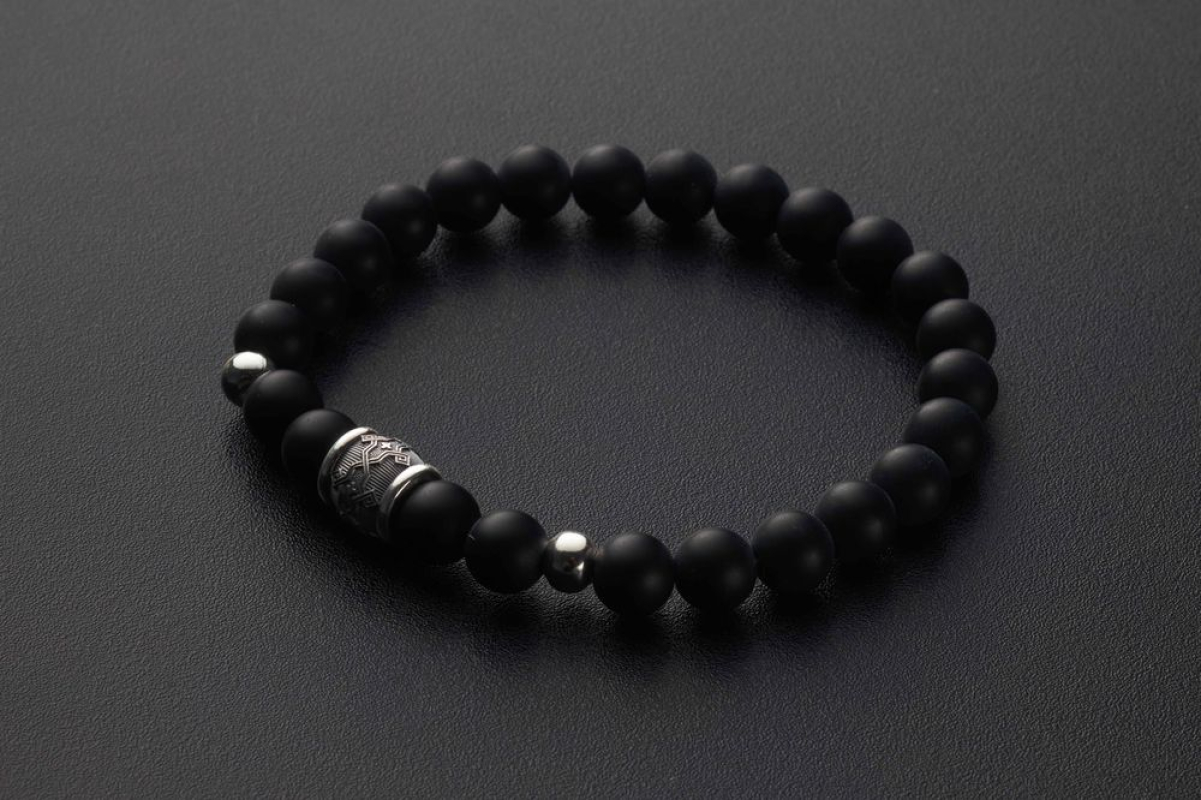 Браслет выполнен из шунгита со вставками из серебра 925 пробы. Серебряная бусина украшена традиционным русским орнаментом, в котором повторяется мотив ромба.