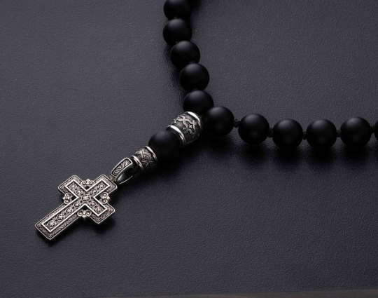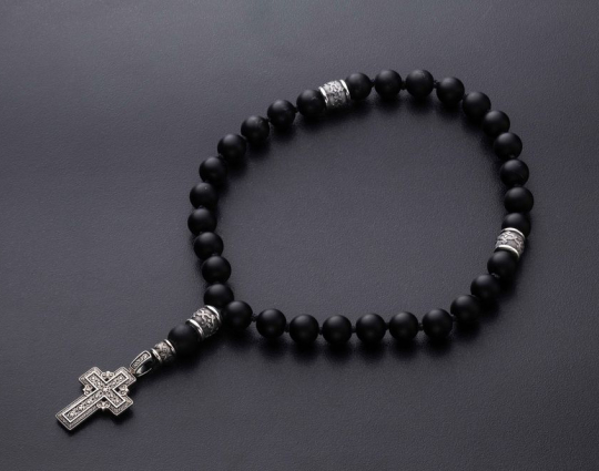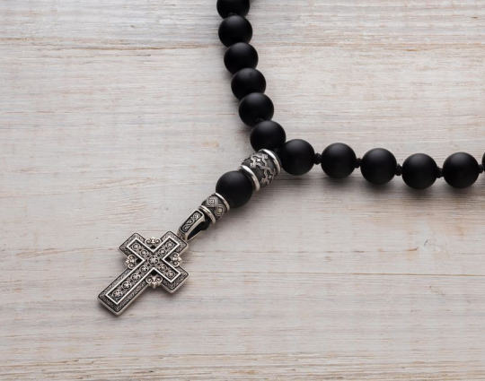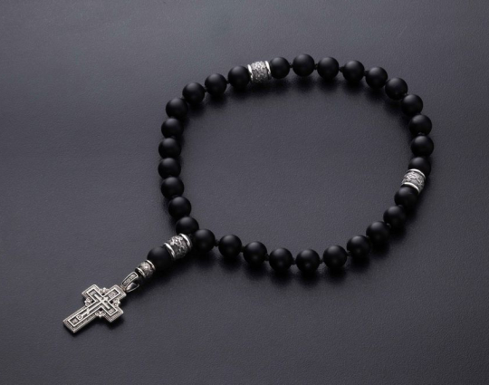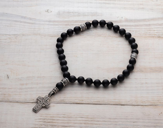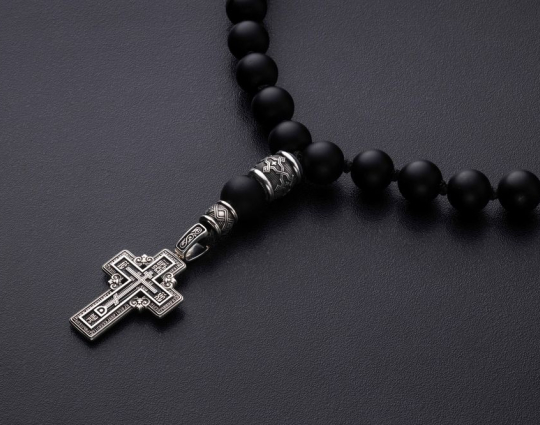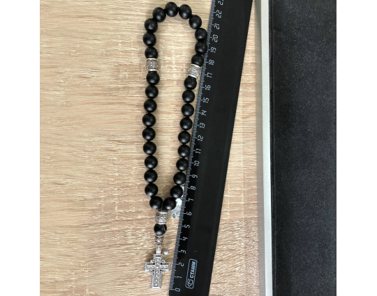 Православные чётки выполнены из натурального шунгита. Матово-черный цвет камня прекрасно сочетается с серебряными бусинами и Голгофским крестом. Такие чётки состоят из 30 зерен и трех разделителей. Это очень удобно для отсчета прочитанных молитв.