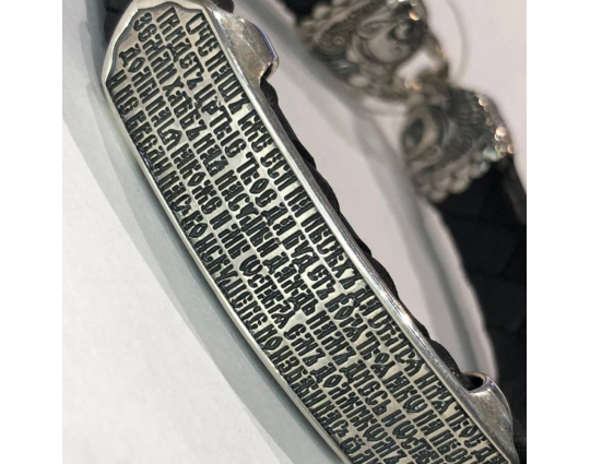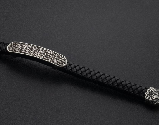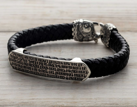 Браслет выполнен из натуральной кожи, а сама пластина - из серебра 925 пробы. Надежный замок выполнен в форме рыб, символа Христа. Так же, апостолы были рыбаками, а впоследствии, когда пошли за Спасителем, стали "ловцами душ человеческих".