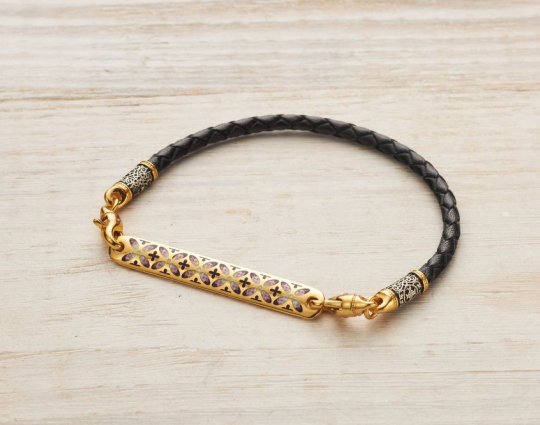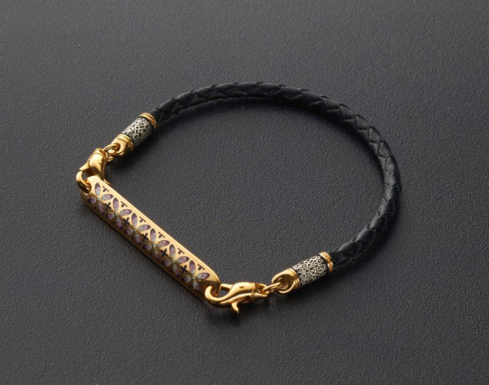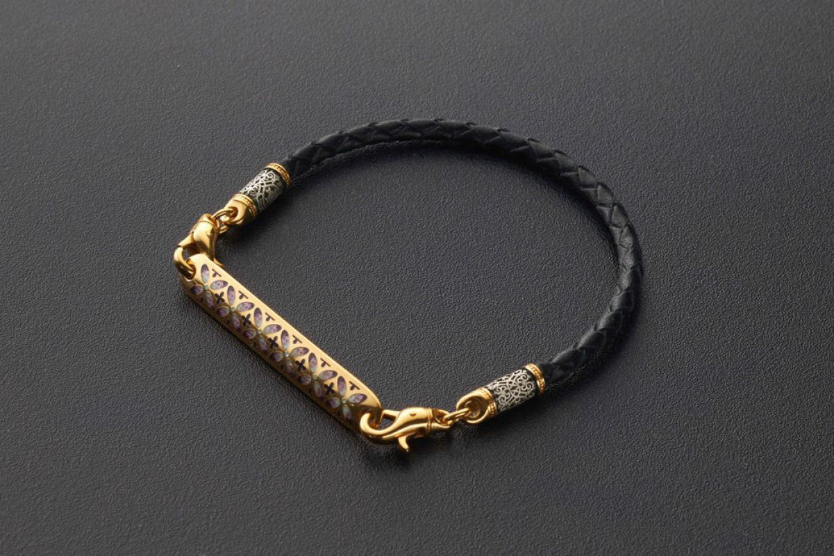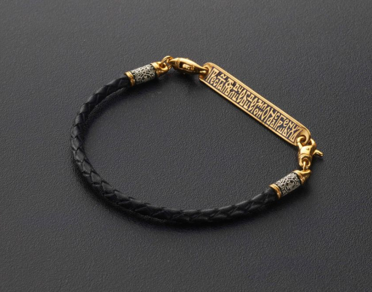 Кожаный плетеный браслет со вставкой в виде серебряной пластины. На вставку нанесены слова-обращения к Богородице: просьба о помощи, заступничестве, прошение о помиловании.