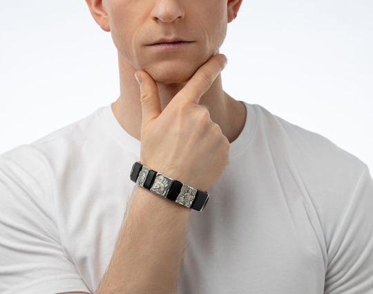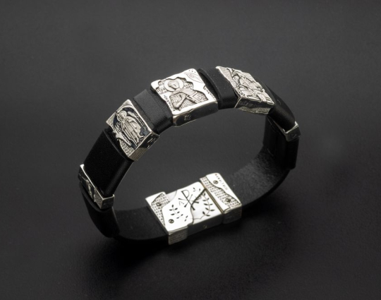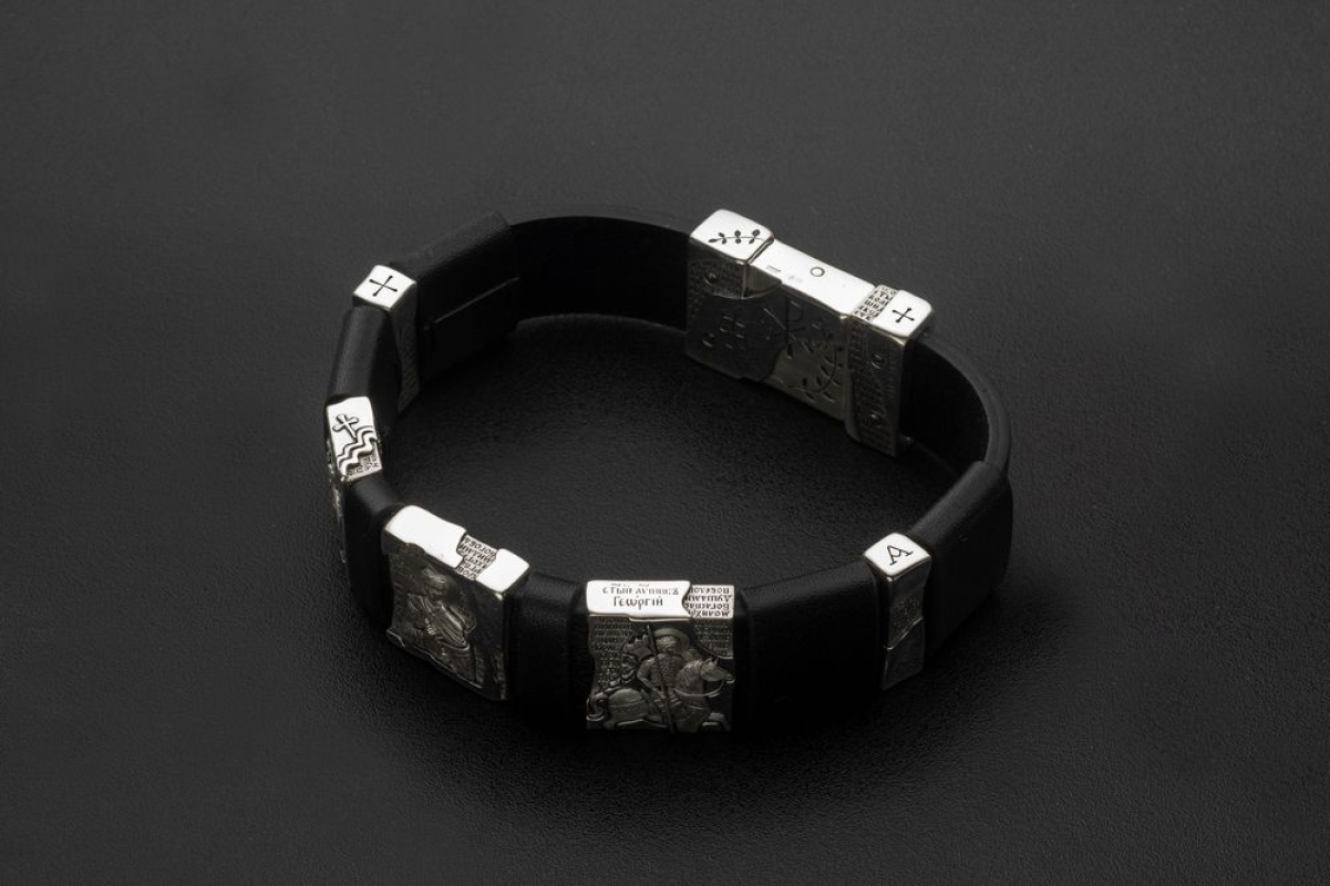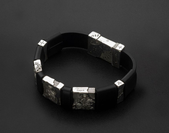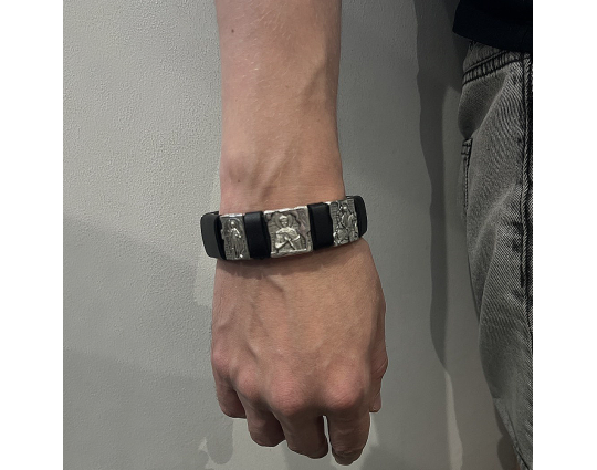 Мужской браслет на крепком кожаном ремешке с серебряными образками. На них изображены святые Георгий Победоносец, Дмитрий Солунский и Иоанн Воин.
