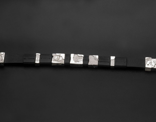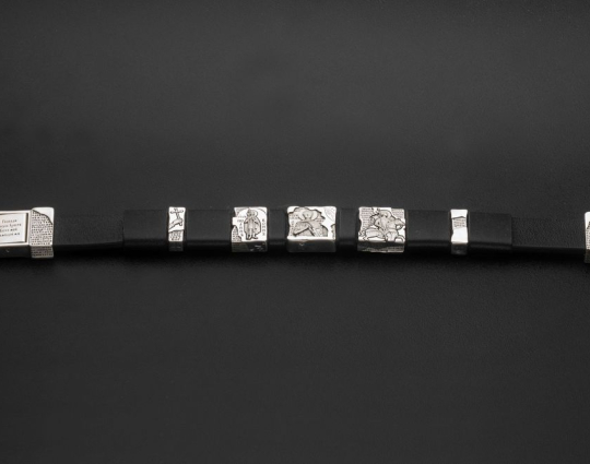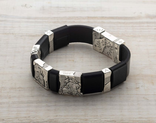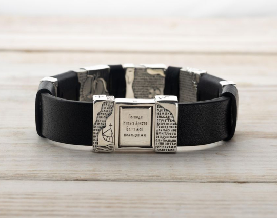 На браслете так же есть христианские символы: Хризма, Альфа и Омега, благословляющая рука, корабль, якорь, лоза и др. На пластинах из серебра начертаны слова молитв: