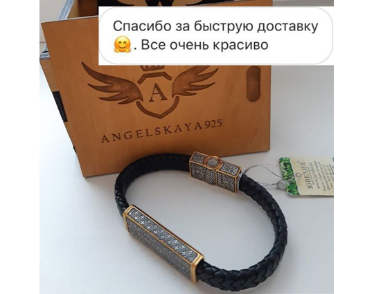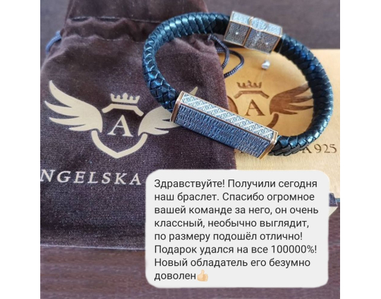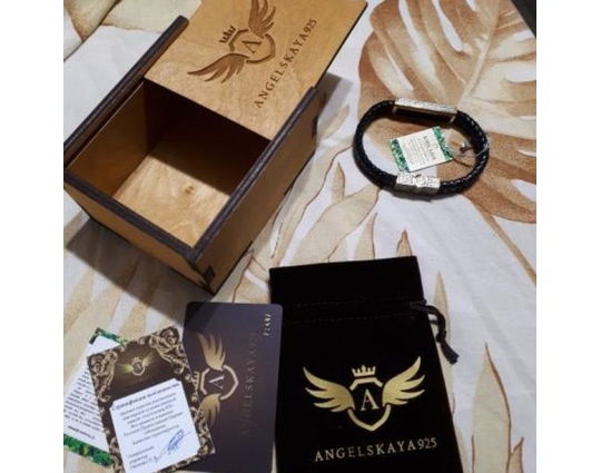 Кожаный браслет, выполненный прочным плетением, исключающим разрывы и деформации. На основу закреплена широкая несъемная пластина, на которую нанесены слова 116 Псалма. Это самая короткая молитва. Она восхваляет Бога во всех его проявлениях и содержит призыв верующим поклоняться Всевышнему за его милости.