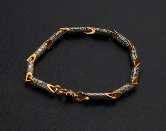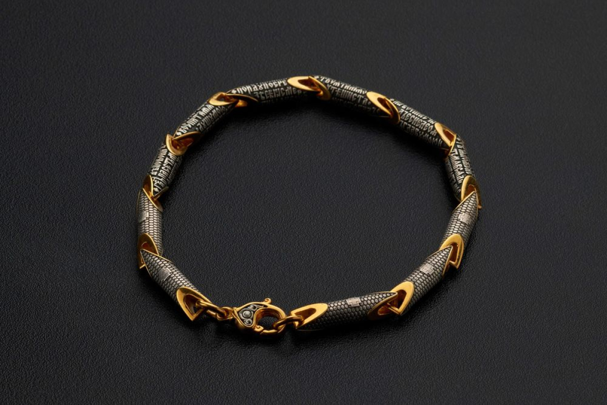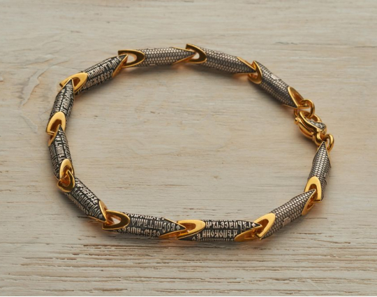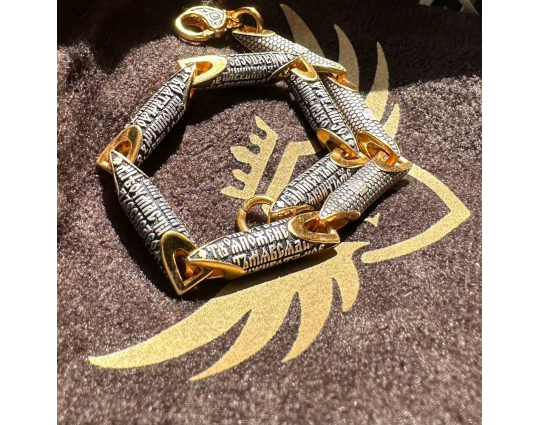 Литой браслет из серебра 925 пробы с позолотой. На звеньях находятся слова молитвы из 22 псалма Царя Давида. В этой молитве говорится, что Господь - это свет, и он просит от своих людей нравственной чистоты и святости. Только тогда человек может надеяться на его помощь, защиту и покровительство.