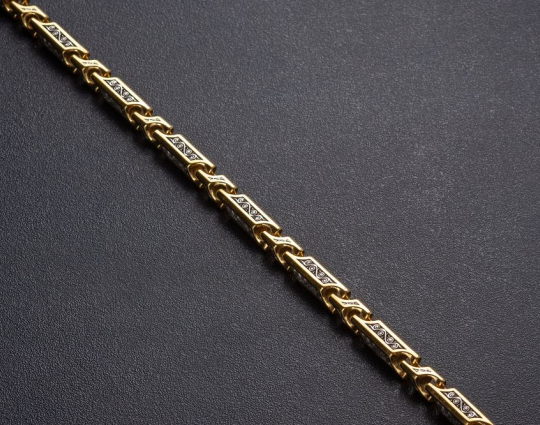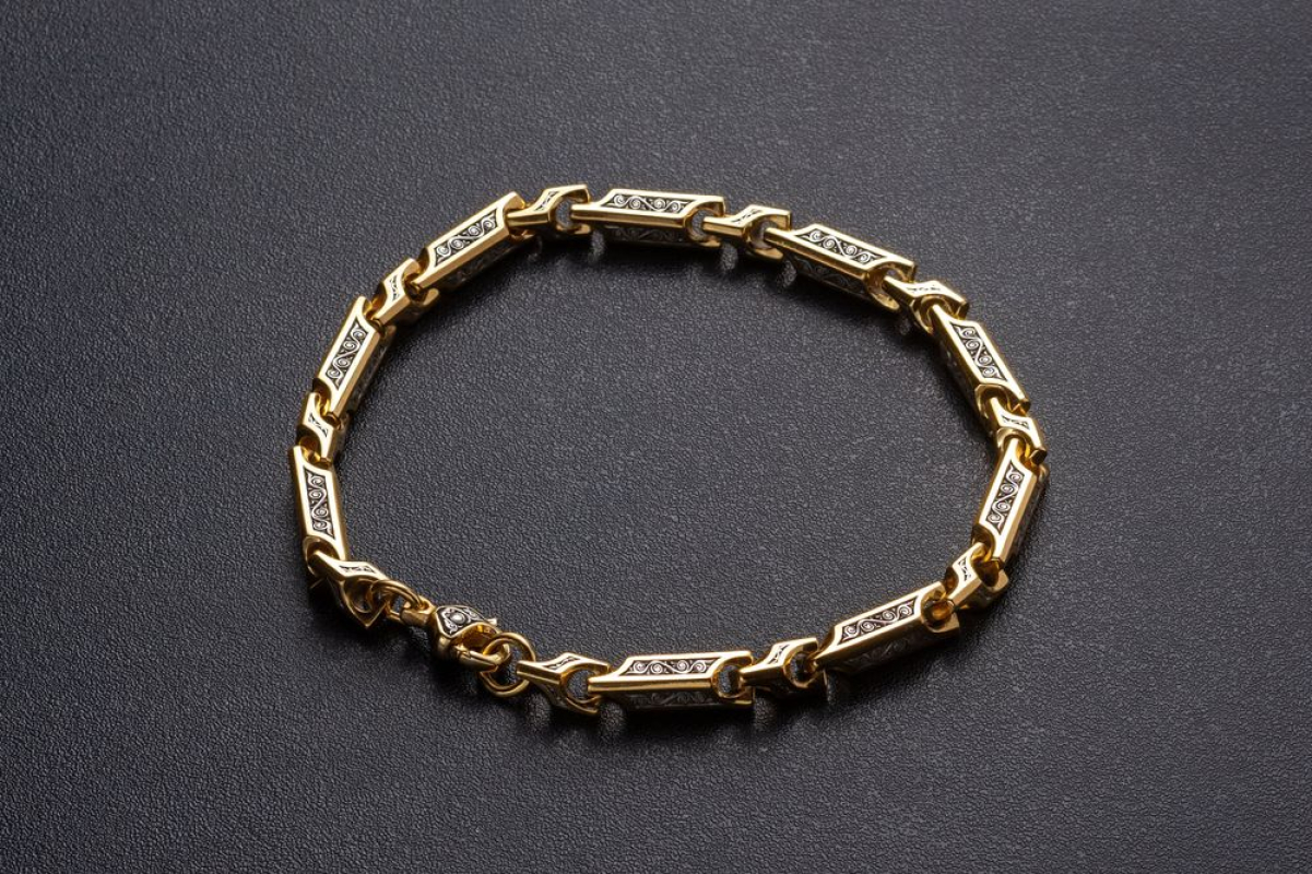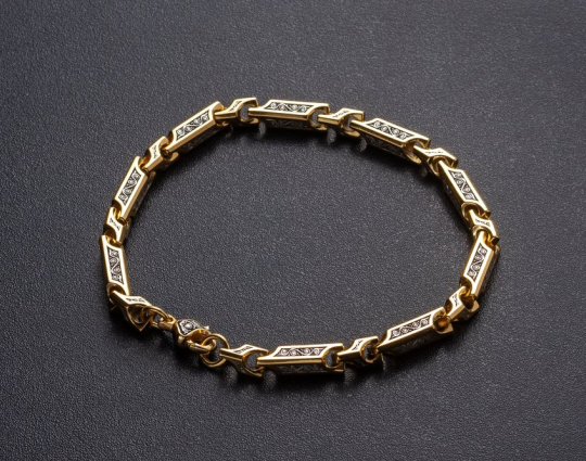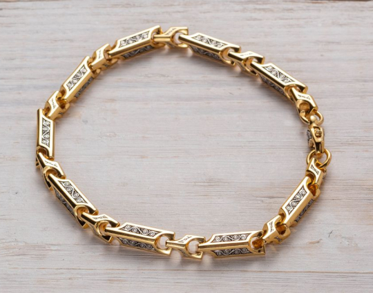 Серебряный браслет с позолотой, состоящий из звеньев геометрической формы. На них нанесен орнамент.  Сам корпус звена затемнен.
