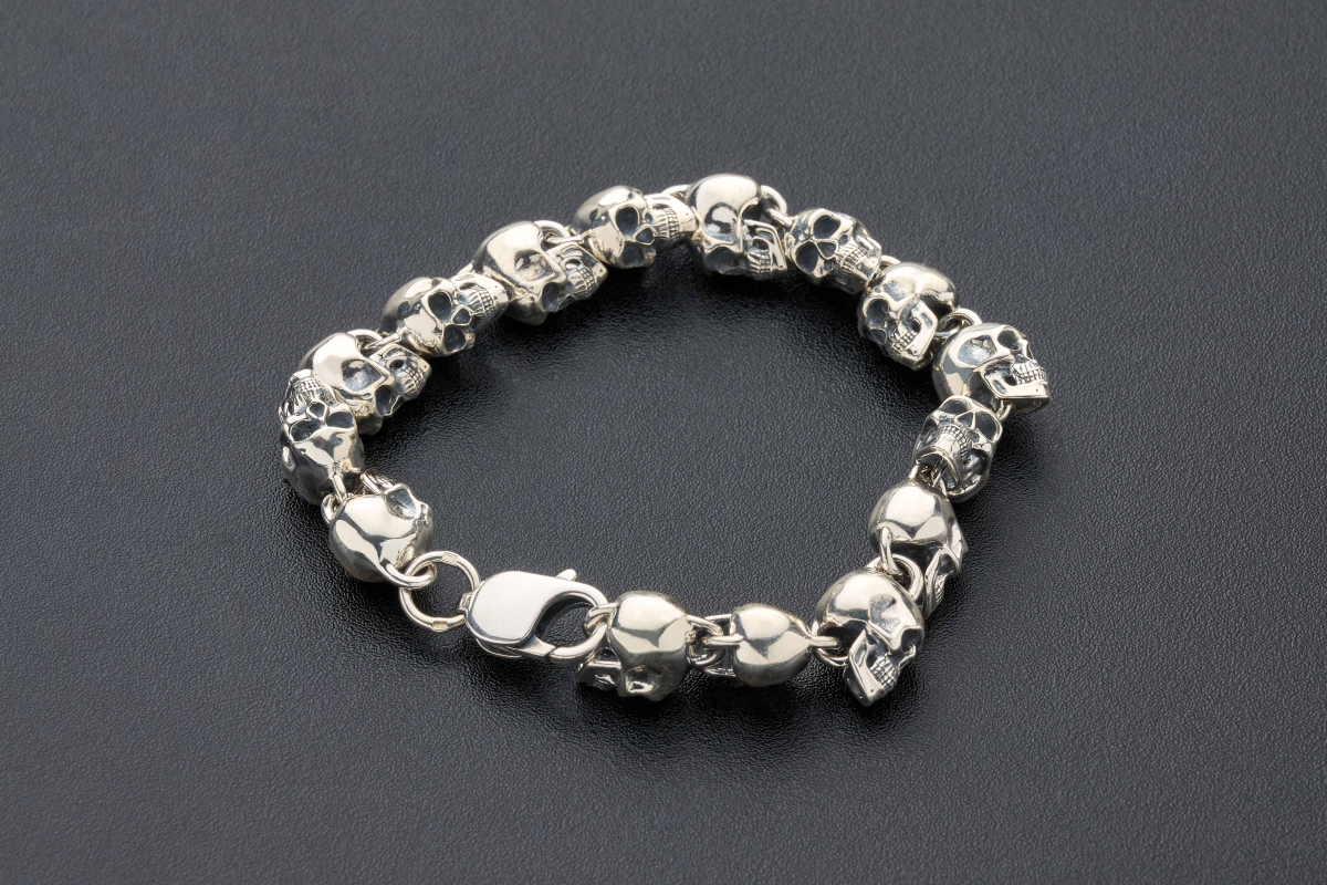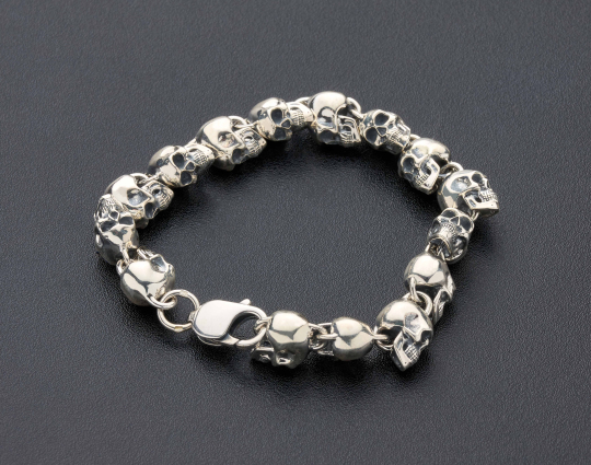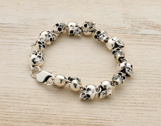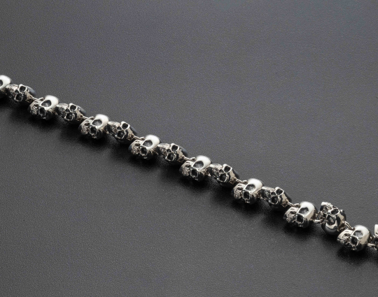 Браслет с черепами выполнен из серебра 925 пробы. Тот, кто носит его на руке, напоминает себе об искуплении грехов, спасении души. Существует легенда, что Голгофа, это не только место казни Христа, но и место захоронения Адама. Поэтому в нижней части нательных крестов часто изображается череп, как его останки.